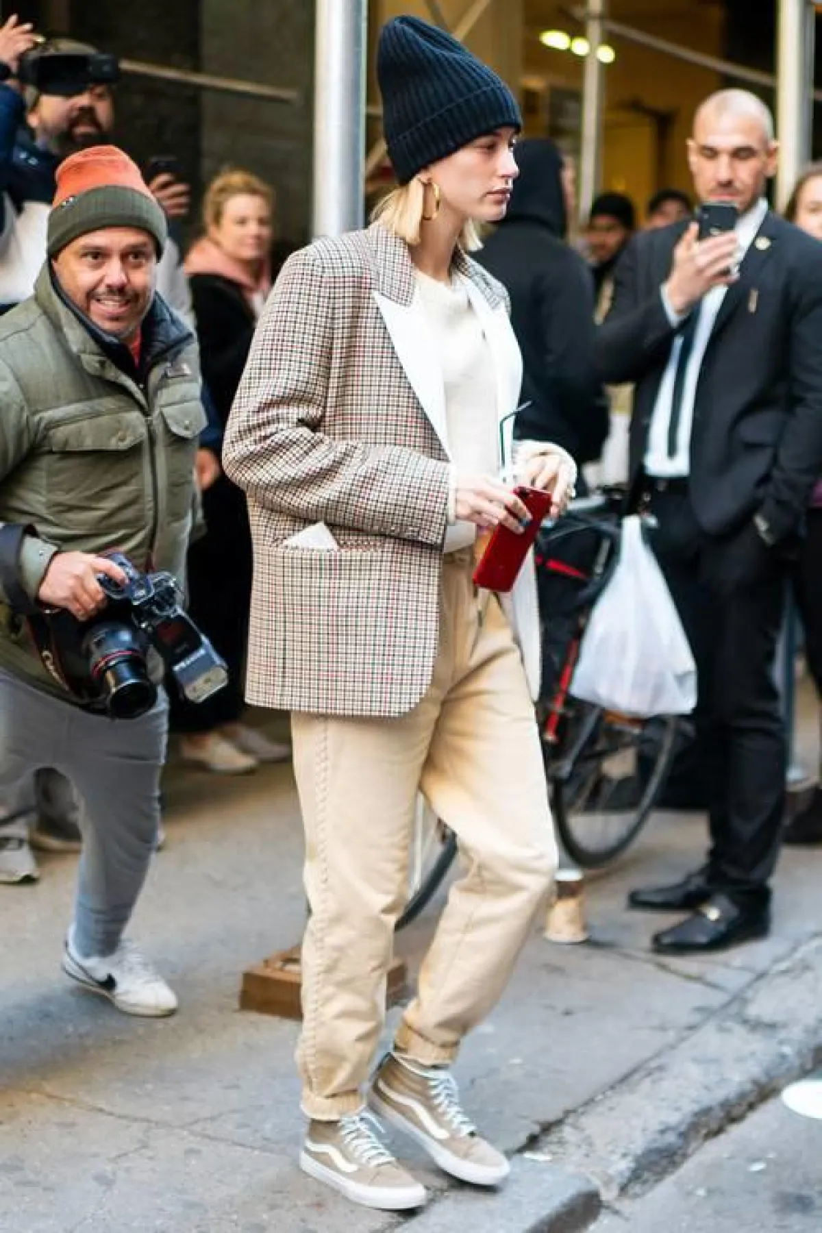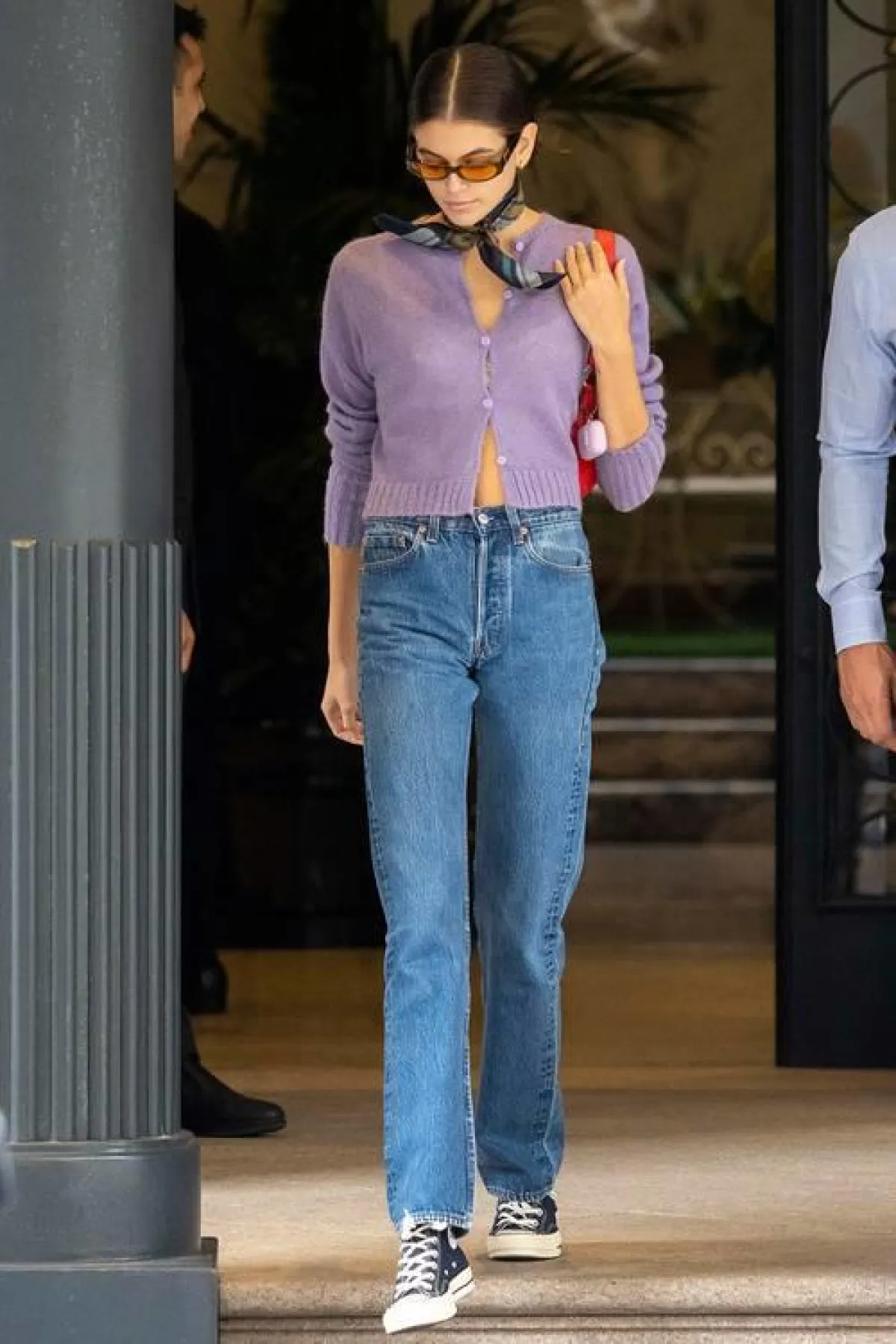 العارضة الشابة كايا جربر Kaia Gerber ذهبت إلى إطلالة مستوحاة بالكامل من حقبة التسعينات، ارتدت زوج من الأحذية الرياضية برقبة عالية للكاحل مع بنطلون مستقيم الساق وسترة الكارديغان.