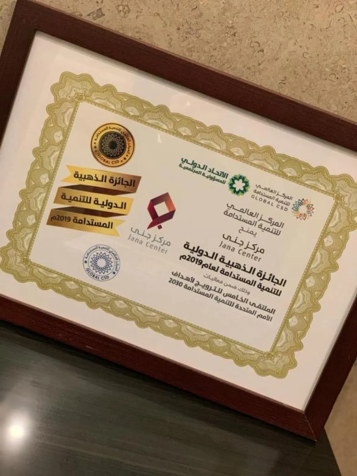 حصد المركز السعودي «جنى»، المختص في دعم الأسر المنتجة، الجائزةَ الذهبية الدولية للتنمية المستدامة للعام 2019، والصادرة بالتعاون بين المركز العالمي للتنمية المستدامة التابع للأمم المتحدة والاتحاد الدولي للمسئولية المجتمعية، وذلك خلال الملتقى الخامس للترويج لأهداف الأمم المتحدة للتنمية المستدامة 2030، الذي أقيم مؤخرًا في مملكة البحرين، تحت شعار (استراتيجيات التنمية المستدامة في الأمم المتحدة).