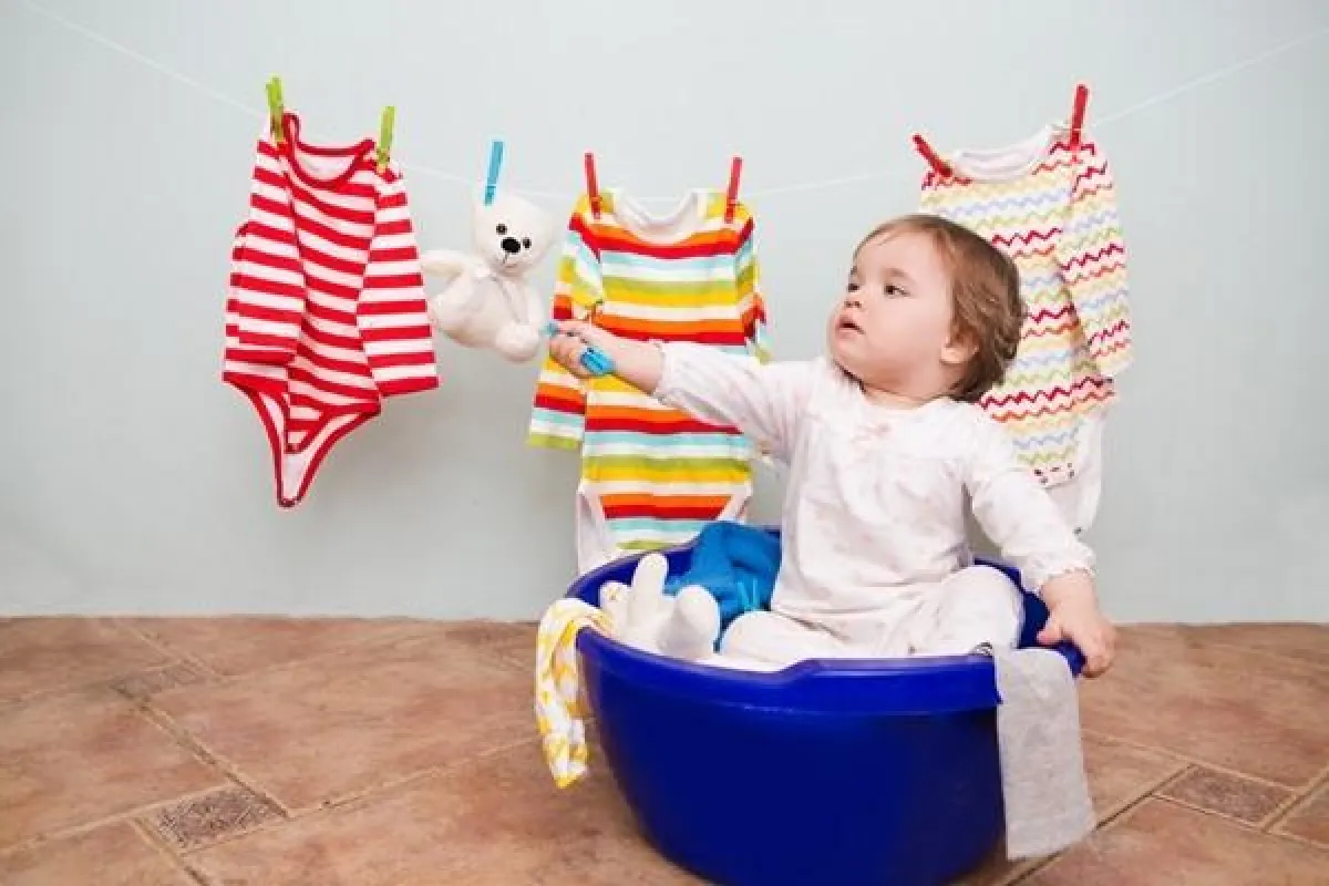 4. تستدعي بقع الحبر والألوان على رداء الطفل، نقعها في وعاء يحتوي على ماء فاتر، مع إضافة فنجان صغير من خلّ التفاح أو سائل الجلي إليه، والانتظار حتى تزول البقع. تنجح هذه الحيلة غالبًا مع بقع الحبر فور حدوثها. وبالإمكان أيضًا استخدام معجون اﻷسنان (أو معجون الحلاقة)، مع اسفنجة ناعمة لإزالة بقعة الحبر تحت ماء جار، بخاصَّة إذا كان رداء الطفل مصنوعًا من الحرير والـ"شيفون". وإذا كانت البقعة "مستعصية"، يستخدم القليل من الخل الأبيض، والقليل من النشاء لصنع معجون، بغية التخلُّص منها. ومن الطرق أيضًا، وضع القليل من الملح الخشن على مكان البقعة، بدون بلها أو نقعها، ثمَّ إضافة بضع نقاط من الليمون الحامض، مع ضرورة وضع منشفة أو قطعة ورق تحت رداء الطفل، حتَّى لا تنتشر البقعة على مساحة أوسع، ثمَّ فركها برفق حتَّى تزول بقعة الحبر، بصورة تدريجيَّة، ووضعها في ما بعد في الغسَّالة على دورة غسيل مناسبة.