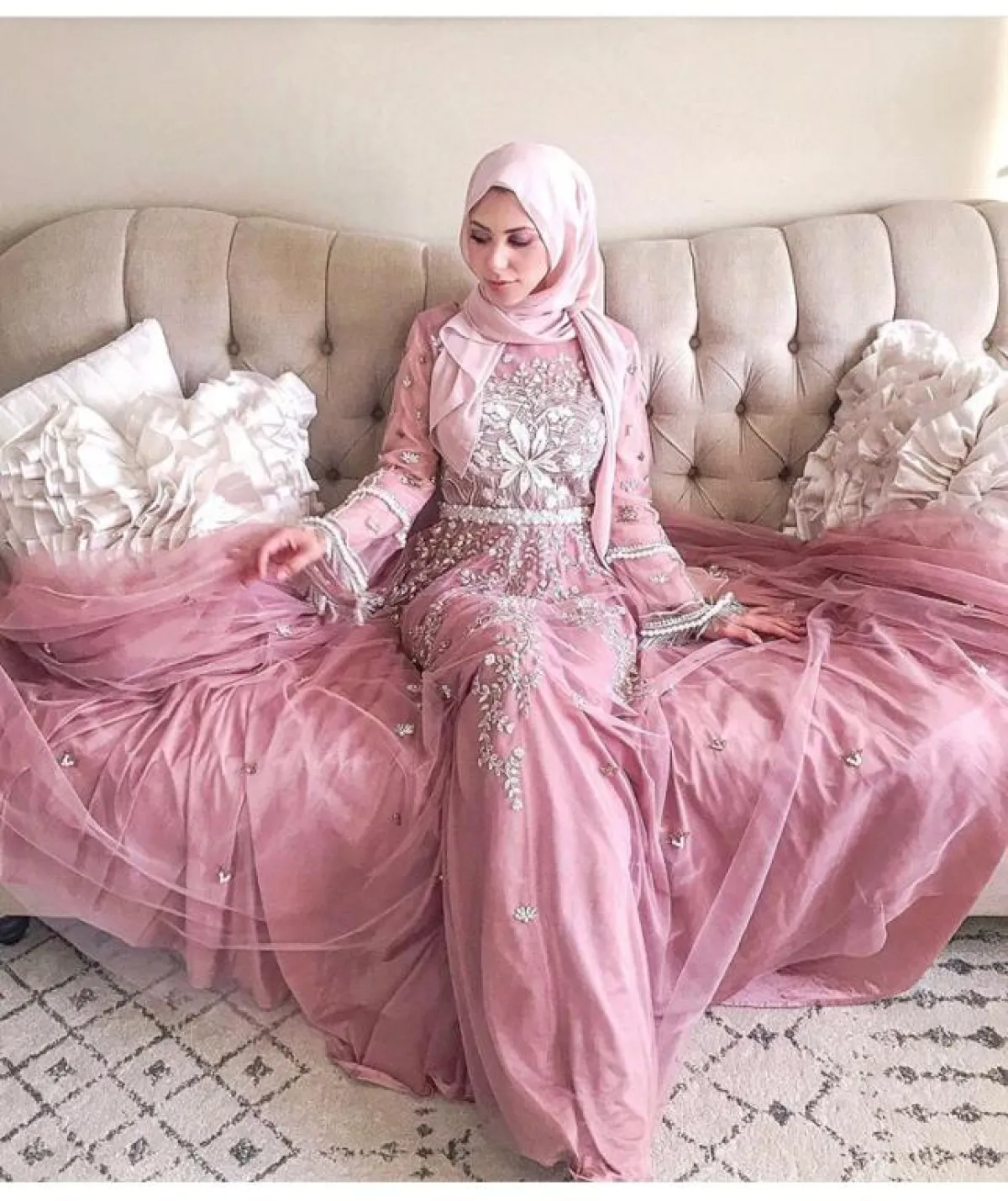 أو يمكنكِ تجربة التصميمات المطرزة الفخمة، كالفستان من الفاشينيستا حنان تيهالي، باللون الروز الأنثوي الناعم، مع تطريزات باللون الفضي على الفستان بطريقة ناعمة، وحزام الخصر الجذاب، مع الموديل الساتان المغطى بالتول المنفوش.