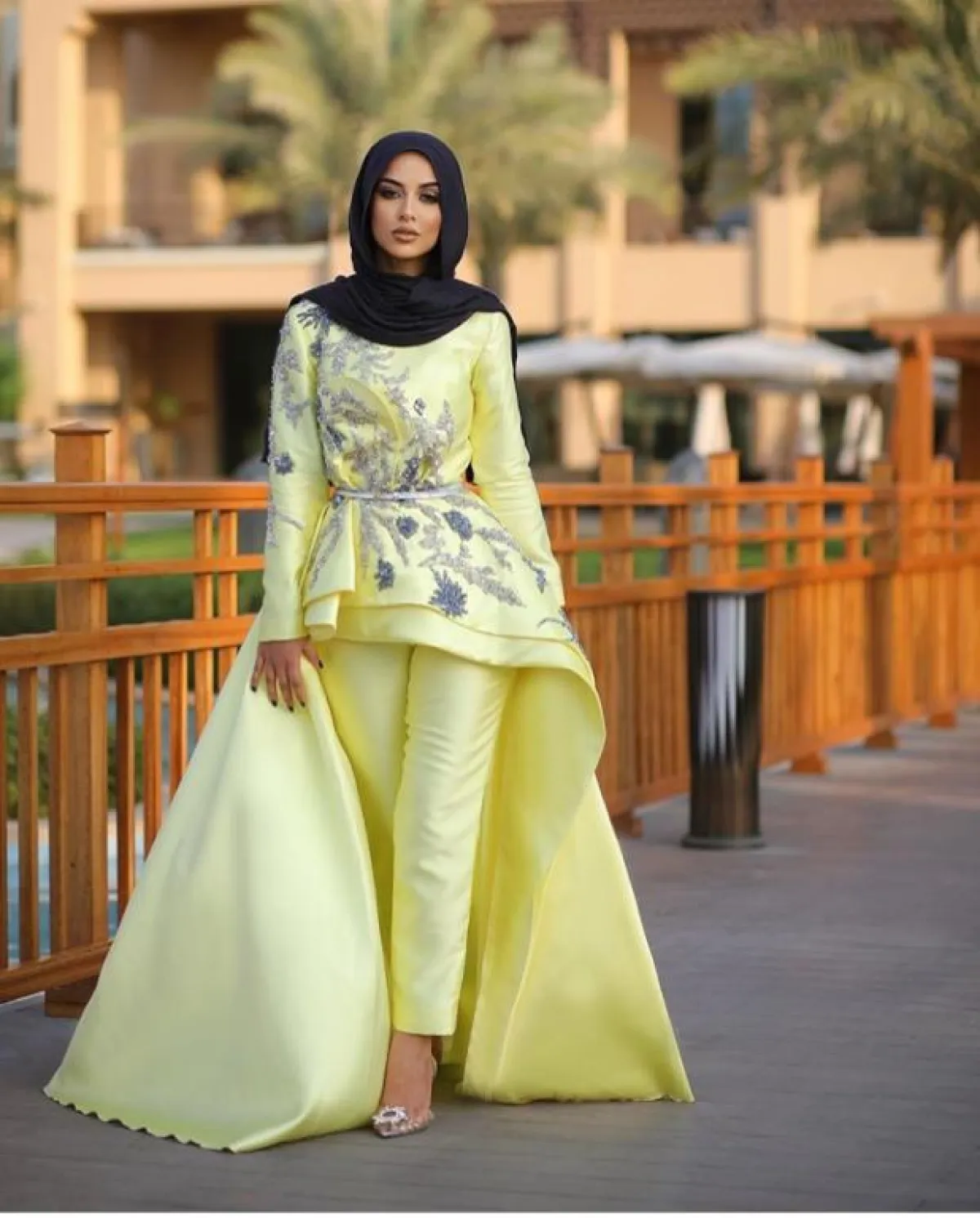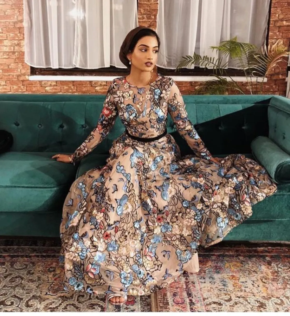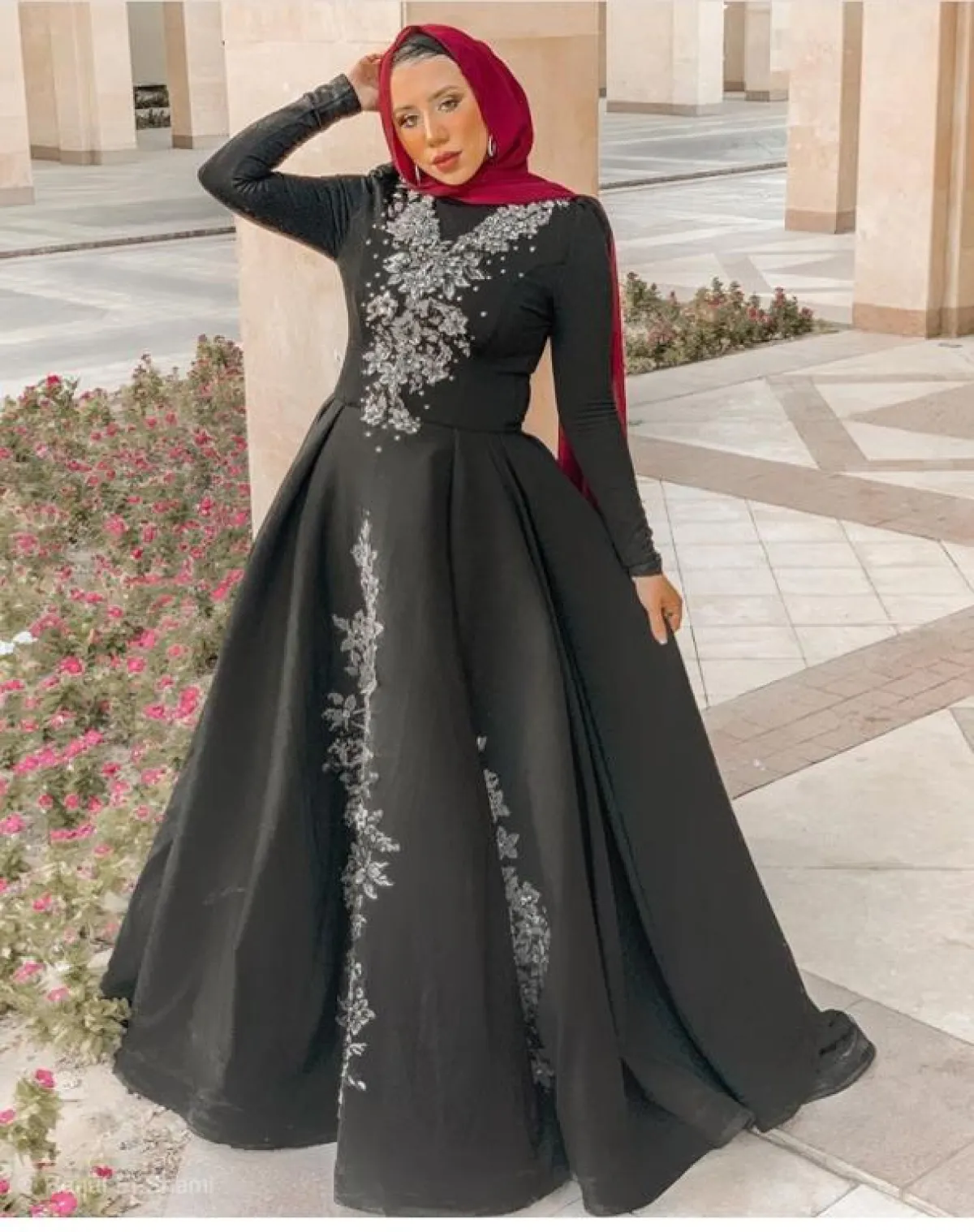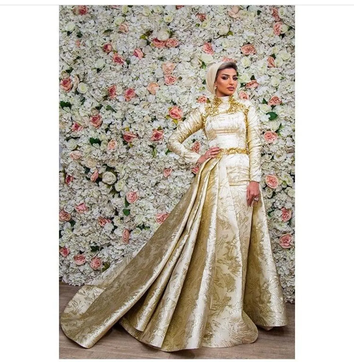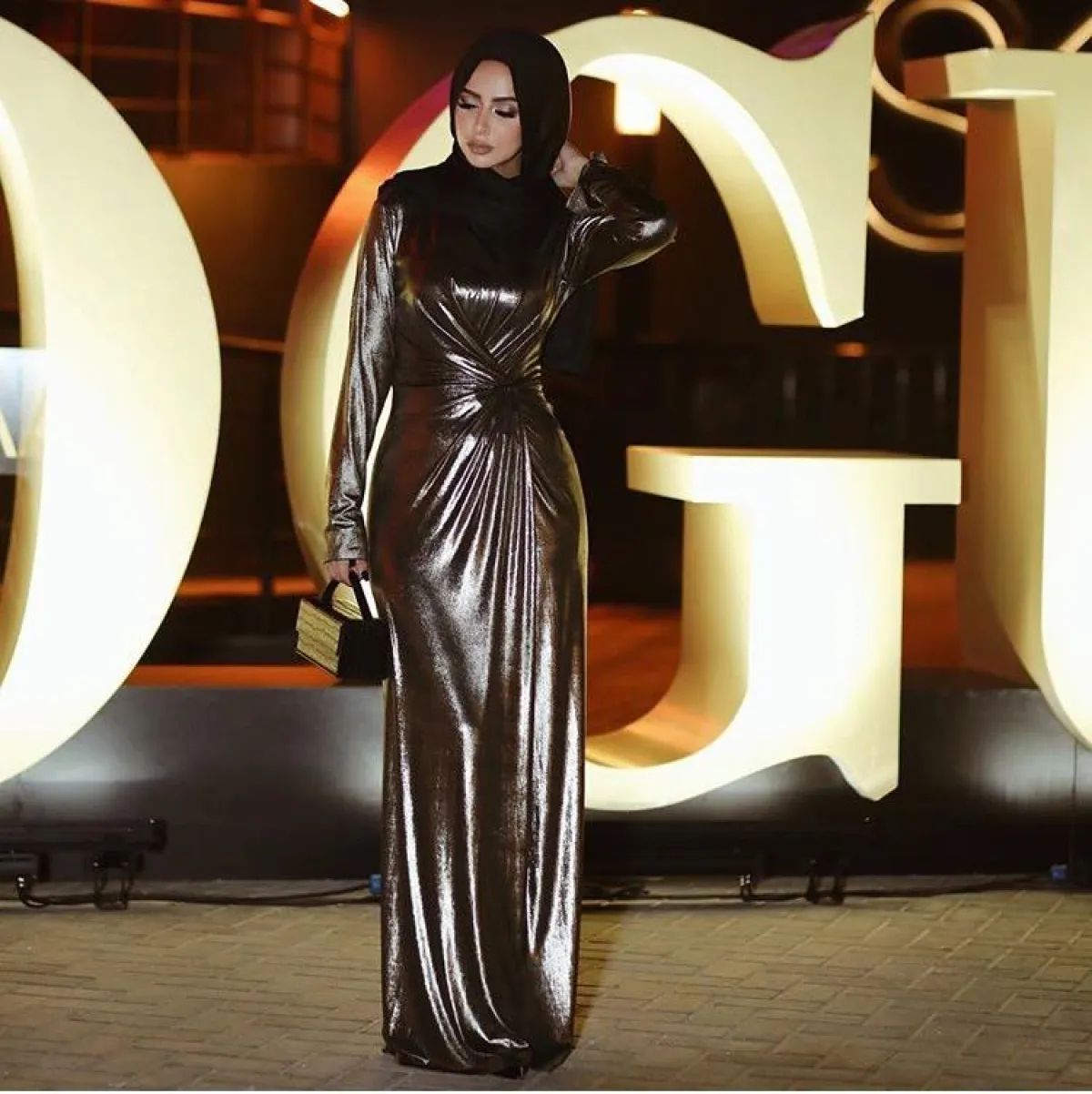 من أفضل الستايلات التي يمكنكِ اعتمادها بحفل خطوبتِك، هو اختيار الموديلات الميتالك، فمازالت متربعة على عرش الموضة، كهذا الموديل من الفاشينيستا سهى مات، بالفستان النحاسي الداكن الطويل، مشدود بطريقة مميزة من ناحية الخصر، ليُبرز رشاقتكِ، نسقت معه حجابًا أسود، مع مكياج ترابي بلمسة نحاسية لاطلالة متكاملة.