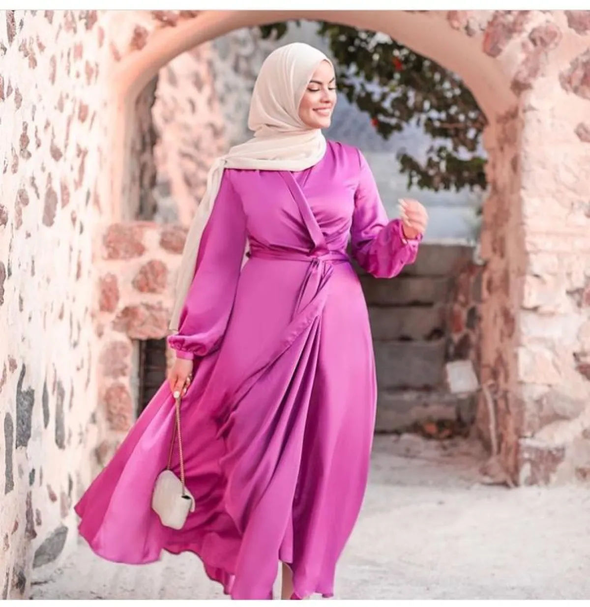 الصبايا صاحبات الذوق الرقيق، والتي تفكر في عمل حفل صغير للخطوبة بالمنزل، يمكنكِ اعتماد هذا الفستان من الفاشينيستا ظهيرة، للفستان الفوشي ذي الأكمام الطويلة والأكتاف المنفوخة العصرية، مع العنق العالي، نسقت مع توربان بيج، وأقراط أذن أضافت لمسة جذابة للوك ككل.