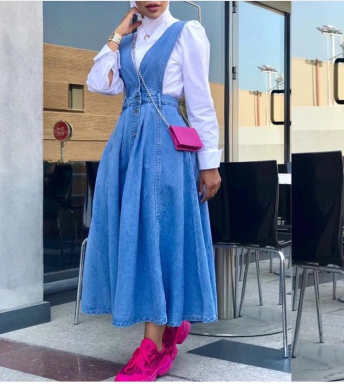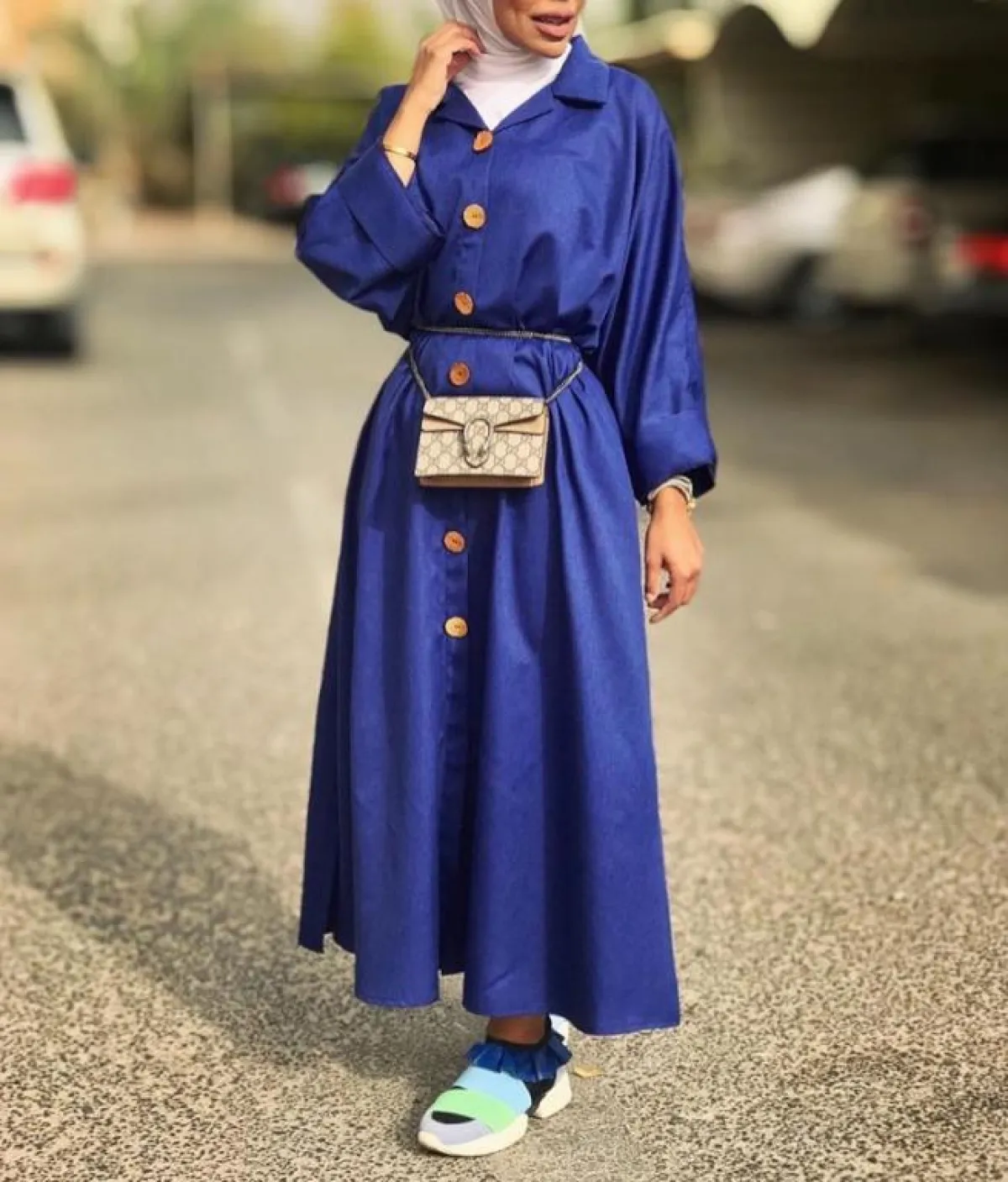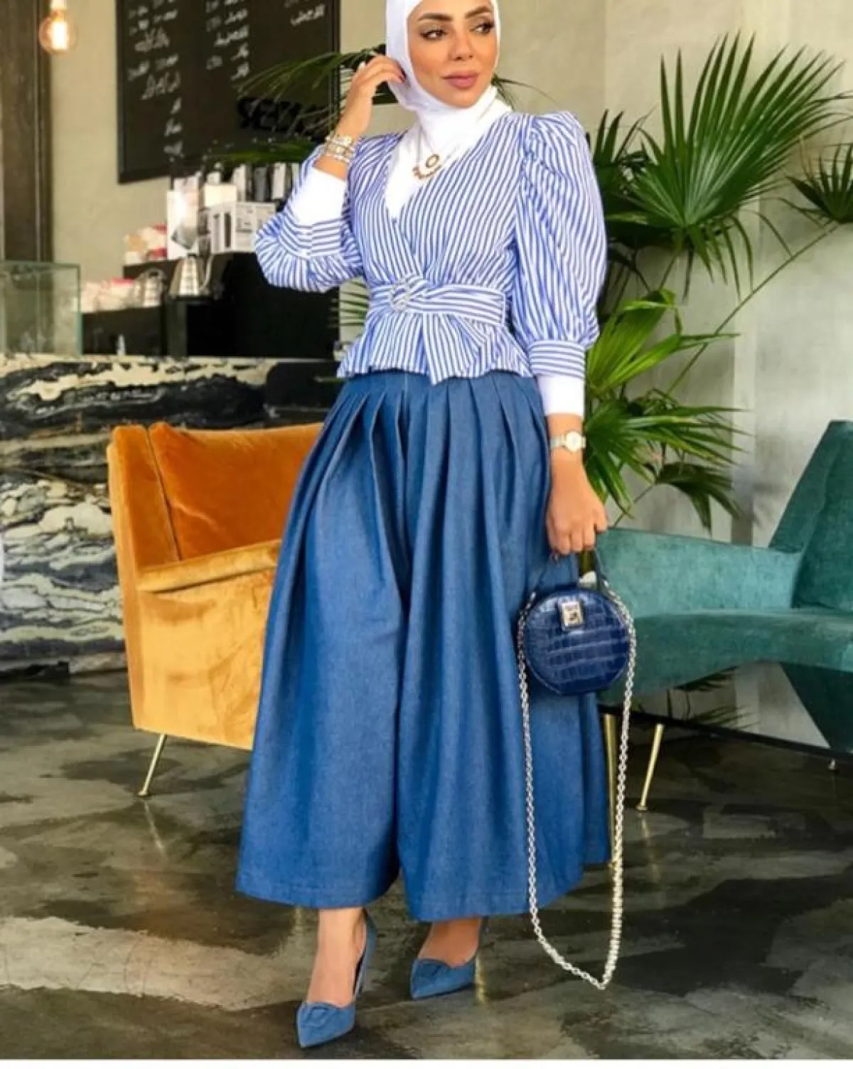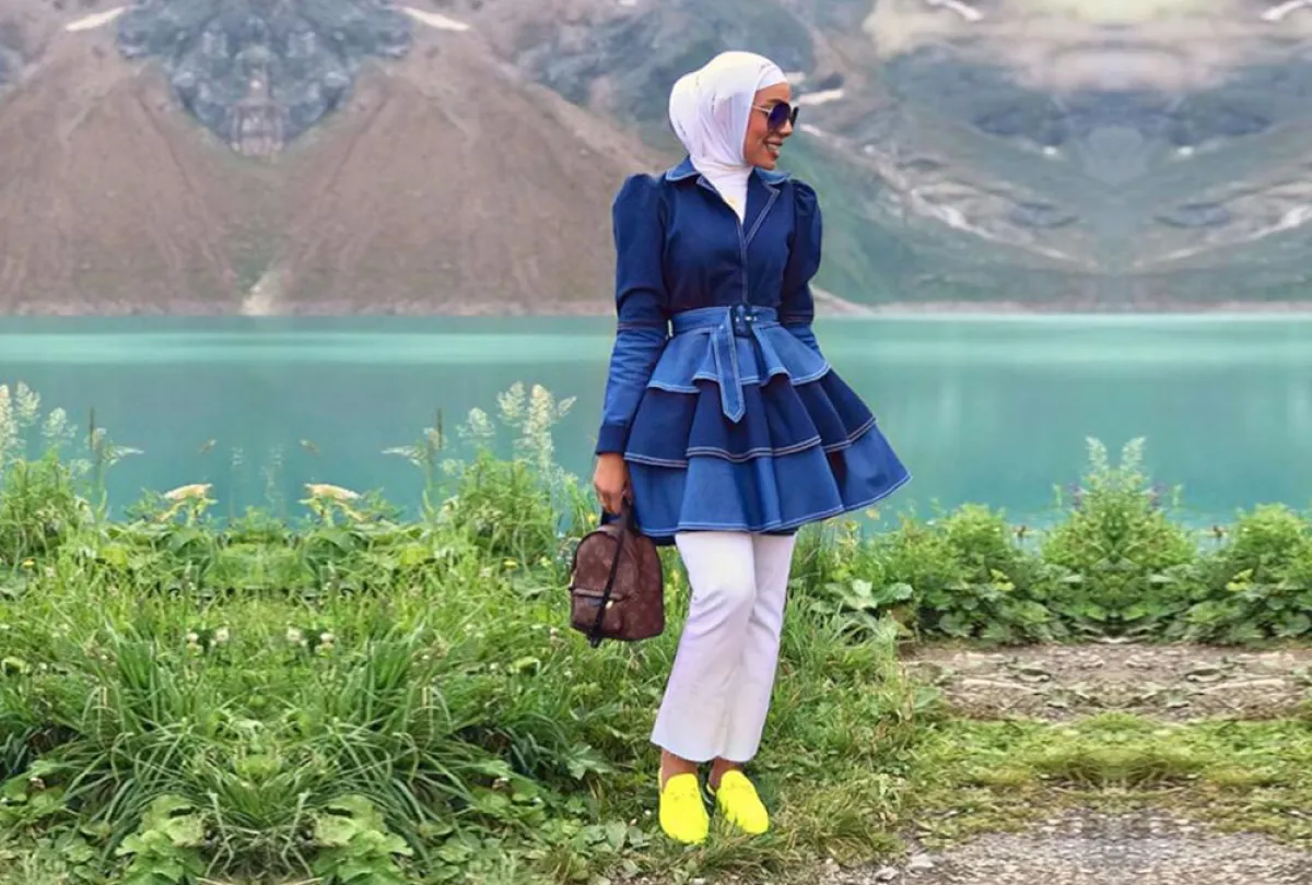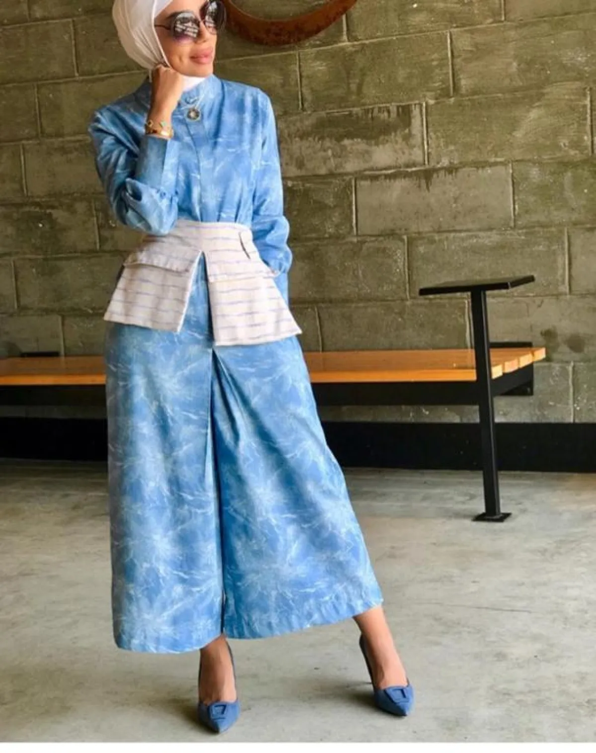 لاحظنا أنّ عواشة الهازمي لا تغيّر على الإطلاق من لون الحجاب الأبيض، أيًّا كان اللوك الذي اعتمدته، وهذه الدرجة البيضاء البسيطة تناسب كثيرًا درجات الأزرق، بخاصة وإن وقعتِ في حيرة الاختيار بين الدرجات المختلفة، وكذلك هي مناسبة لكل ألوان البشرة الفاتحة والخمرية وللسمروات، كثيرًا، وتفتح لكِ مجالًا أوسع باعتماد ما تشائينه من شنط وأحذية مع القطع باللون الأزرق.