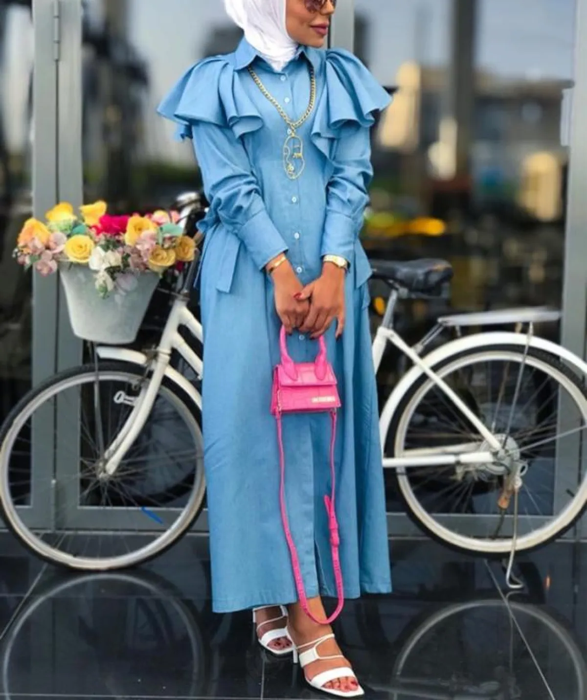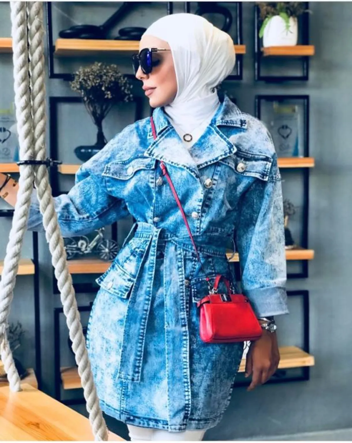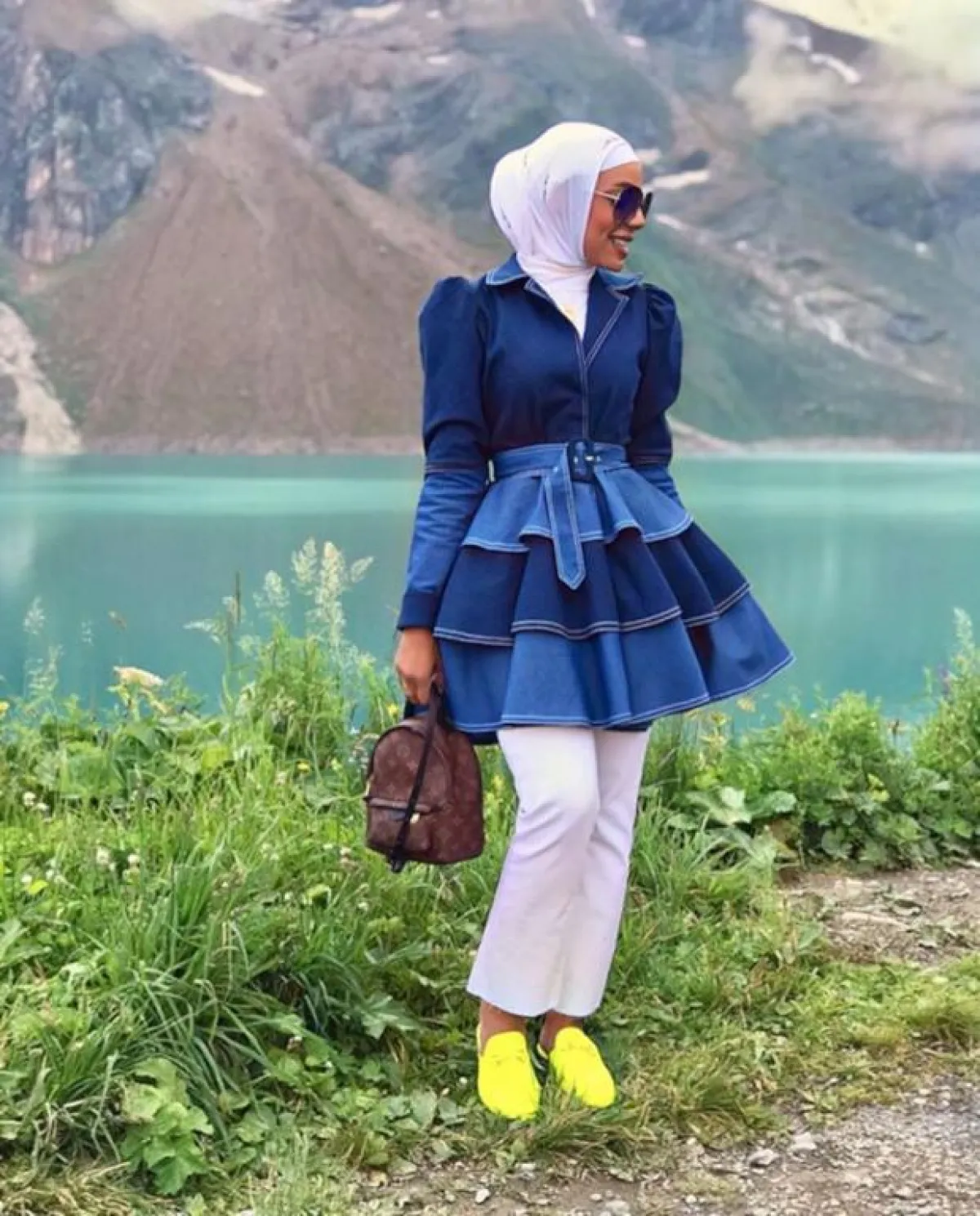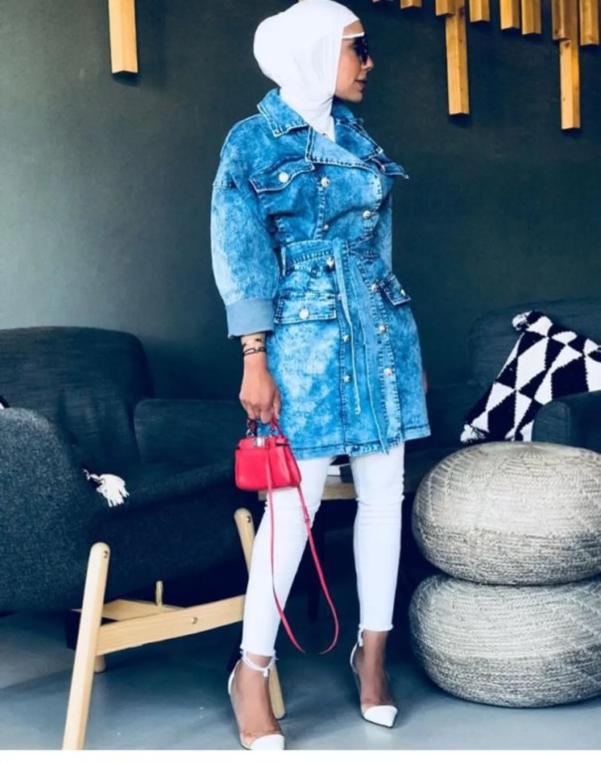 لاحظنا أنّ عواشة الهازمي لا تغيّر على الإطلاق من لون الحجاب الأبيض، أيًّا كان اللوك الذي اعتمدته، وهذه الدرجة البيضاء البسيطة تناسب كثيرًا درجات الأزرق، بخاصة وإن وقعتِ في حيرة الاختيار بين الدرجات المختلفة، وكذلك هي مناسبة لكل ألوان البشرة الفاتحة والخمرية وللسمروات، كثيرًا، وتفتح لكِ مجالًا أوسع باعتماد ما تشائينه من شنط وأحذية مع القطع باللون الأزرق.