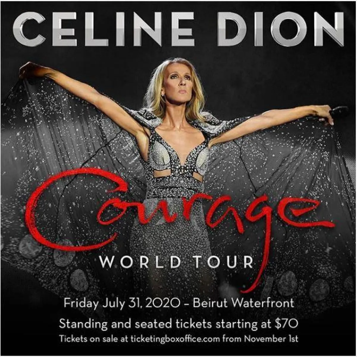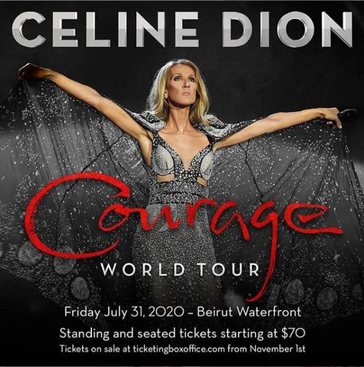 وقد أعلنت مهرجانات "بيبلوس" ، أنّ حفل سيلين ديون سيكون يوم الجمعة 31 يوليو- تموز لعام 2020، أما عن حجز التذاكر فتبدأ من 70 دولارًا، متاح من يوم 1 نوفمبر تشرين الثاني المقبل.