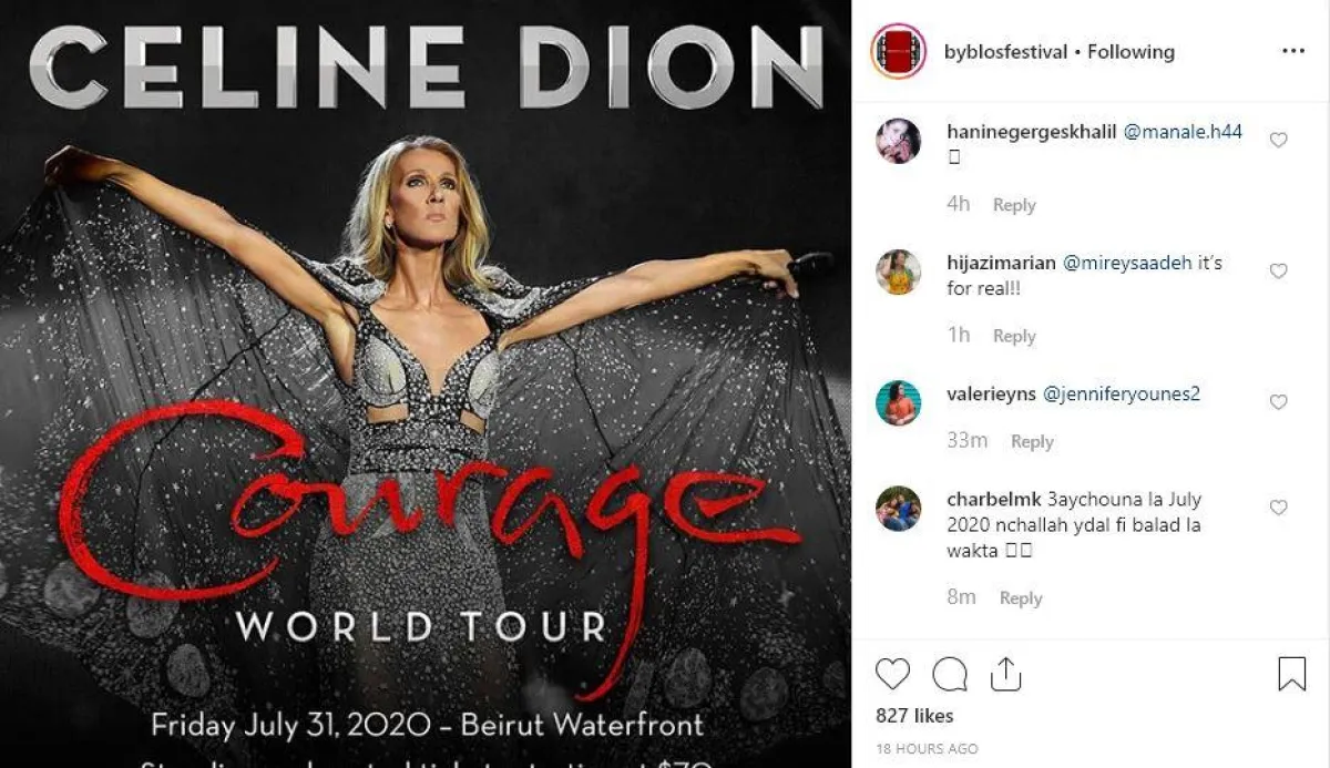 أثارت الصفحة الرسمية لمهرجانات "بيبلوس" ضجة كبيرة بعد نشرها تدوينة ظهرت فيها عبارة: "أراكم قريباً في بيروت.. سيلين"، وذلك تزامنًا مع إعلان الفنانة العالمية سيلين ديون عن مجموعة حفلات مقبلة لها بعد طرح أغنياتها الجديدة.