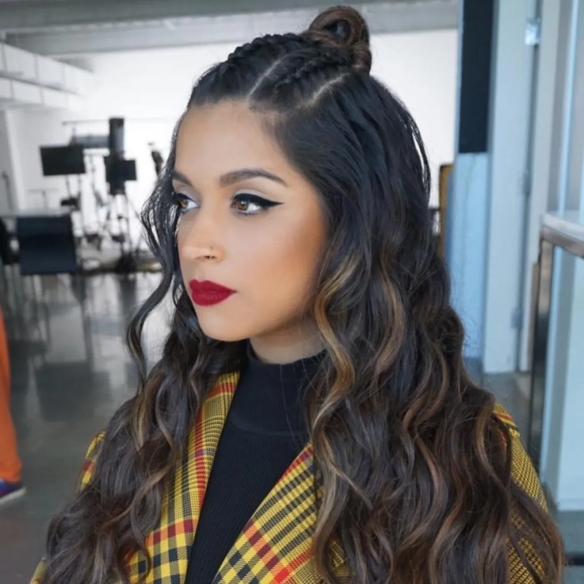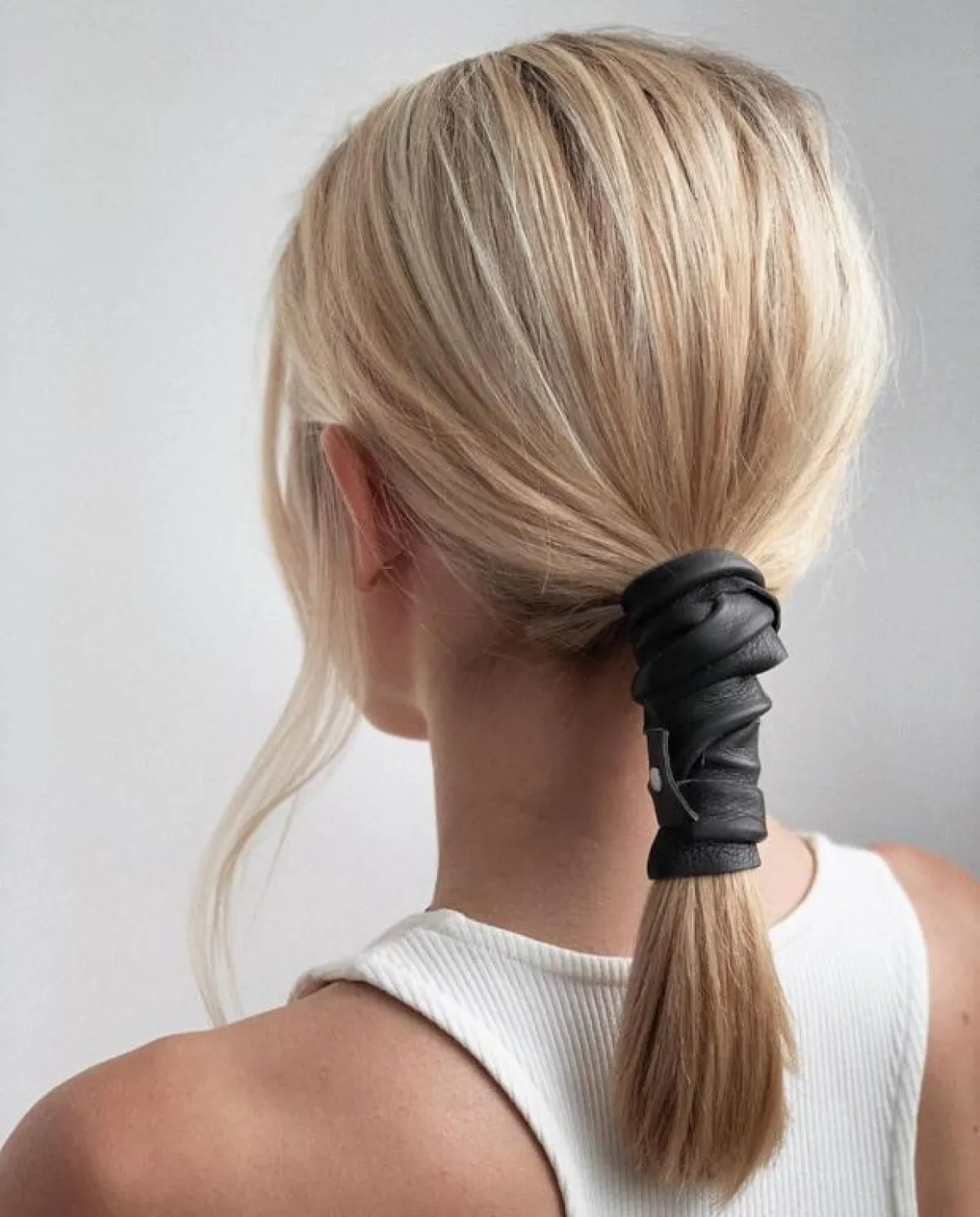 تسريحة ذيل الحصان الملفوفة بأربطة جلدية