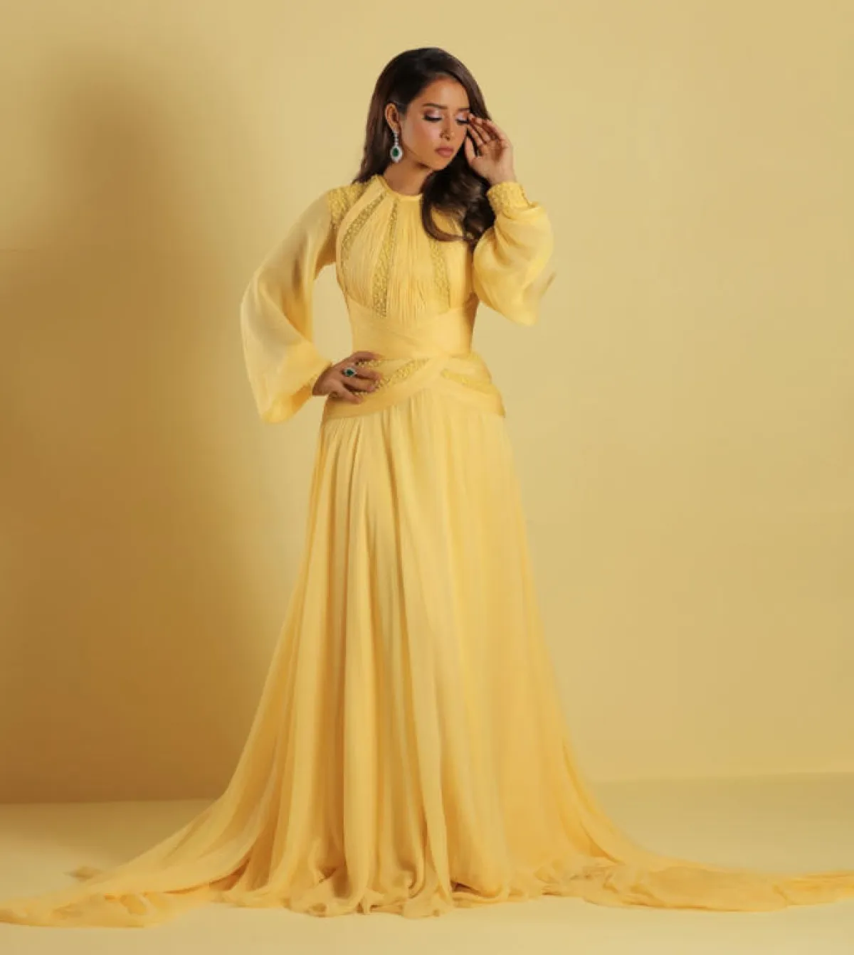 شاهدنا بلقيس فتحي مؤخرًا وقد اعتمدت اطلالة أنيقة وحيوية، اختارت فيها اللون الأصفر بدرجته الهادئة التي ناسبت بشرتها ولون شعرها من جورج حبيقة Georges Hobeika، تصميم الفستان ناعم مع أكمام طويلة، ومحدد الخصر وتنورته منسدلة بطريقة مميزة، وقد نسقت معه أقراطًا ماسية مرصعة بحجر باللون الأخضر.