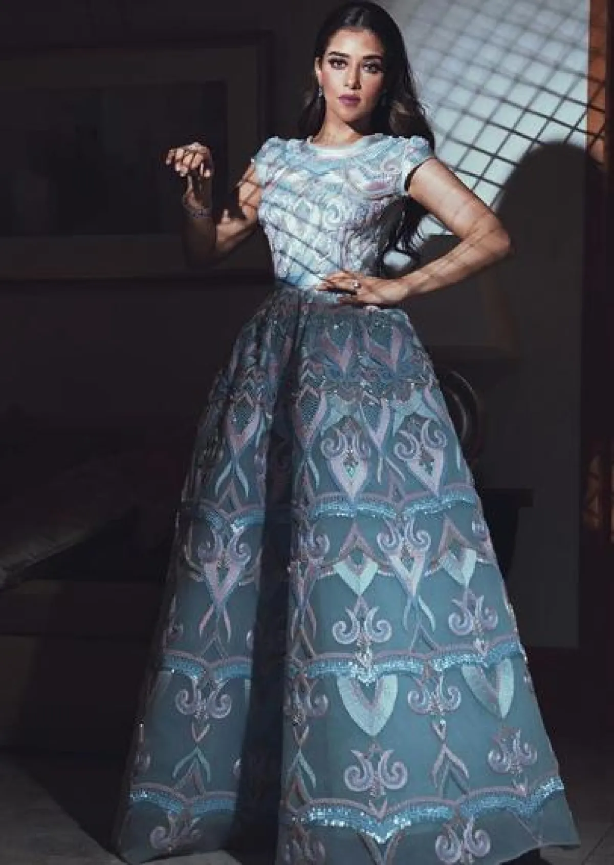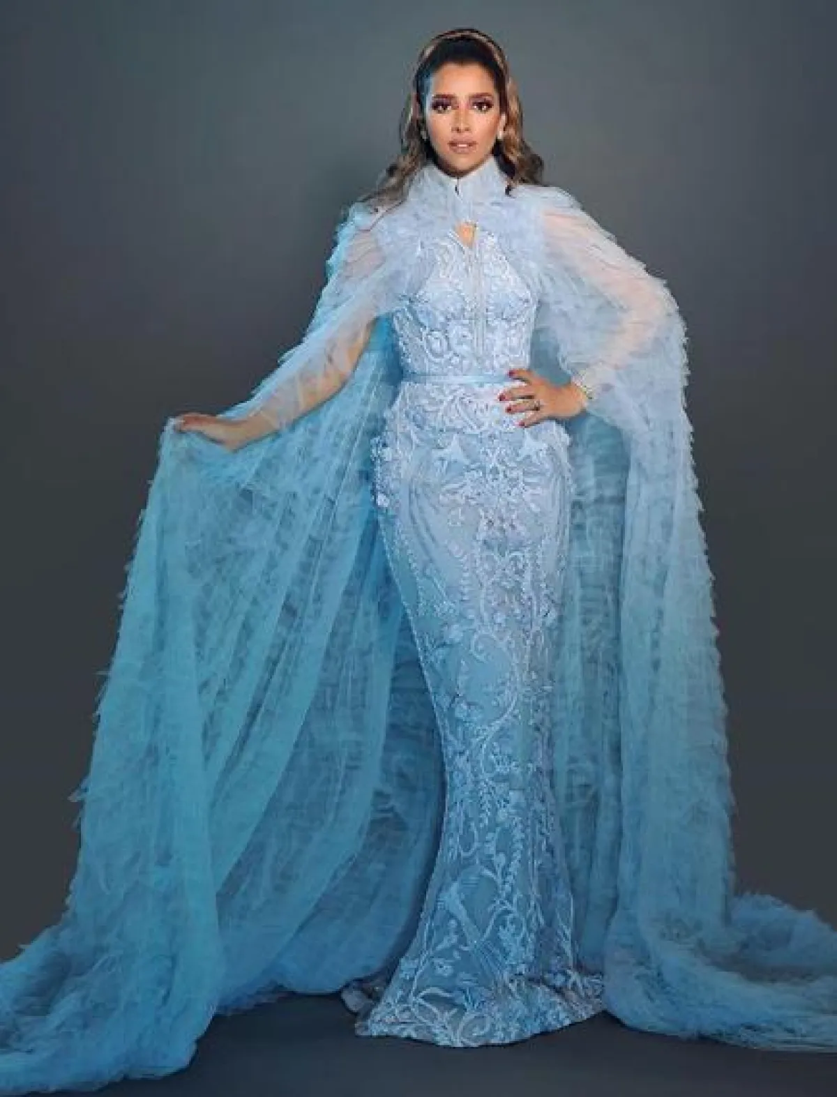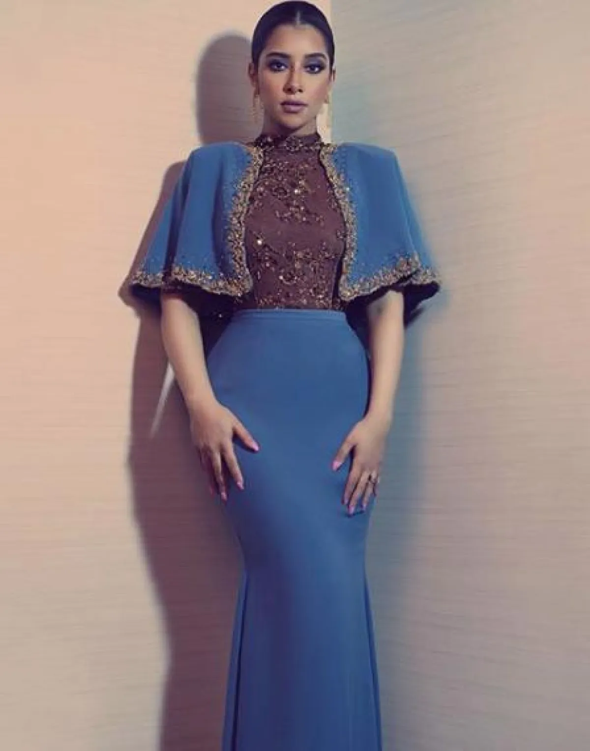 فستان مطرز باللون الأزرق اختارته بلقيس فتحي
