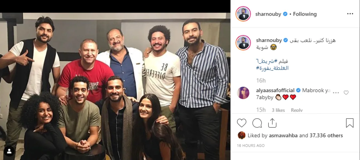 الشرنوبي وجه رسالة غير مباشرة إلى خطيبته السابقة المنتجة سارة الطباخ، بنشر صورة له من كواليس التحضير للفيلم مع النجوم خالد الصاوي وخالد أنور ومحمد عز وتارا عماد، وعلق عليها عبر حسابه بموقع إنستقرام قائلا: هزرنا كتير .. نلعب بقى شوية .. فيلم شريط 6 .. الغلطة بفورة!!