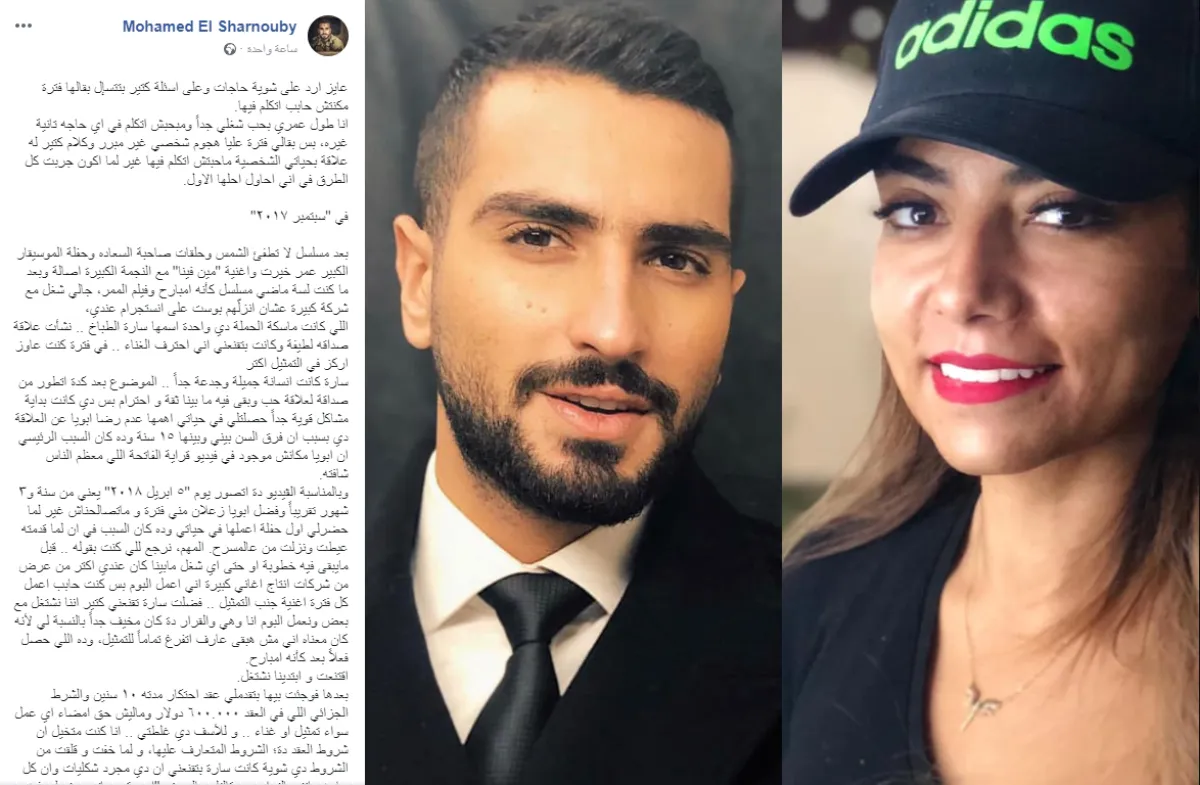 وتابع سرده للقصة بقوله: اقتنعت و ابتدينا نشتغل بعدها فوجئت بيها بتقدم لي عقد احتكار مدته ١٠ سنين والشرط الجزائي اللي في العقد ٦٠٠.٠٠٠ دولار وماليش حق امضاء اي عمل سواء تمثيل او غناء .. و للأسف دي غلطتي .. انا كنت متخيل ان شروط العقد ده؛ الشروط المتعارف عليها، و لما خفت و قلقت من الشروط دي شوية كانت سارة بتقنعني ان دي مجرد شكليات وان كل حاجه هاتتم بالتراضي وقالتلي بالحرف "اي وقت هاتيجي تقولي فيه ان العقد ده مش مريحك هديلك العقد .. عمري ما هغصبك على حاجه" و بسبب ثقتي فيها وحبي ليها وافقت على كل ده ووافقت كمان اني امضي العقد ده رغم انه كان معمول بتاريخ قبله بحوالي ١٠ شهور (بتاريخ اليوم اللي قابلتها فيه تقريباً) .. ومن بعد ما مضيت العقد و بعد ما قريت الفاتحة اللي وقفت قدام كل الناس فيها .. لقيت طريقة تعامل مختلفة تماماً وتوتر بدون أسباب بيحصل بيني وبينها ..