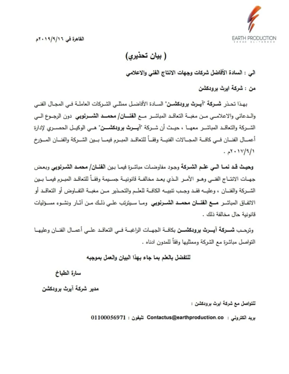 سارة الطباخ أصدرت ما وصفته ب "البيان التحذيري" إلى كل شركات الإنتاج الفني والاعلاني والإعلامي من التعامل المباشر مع محمد الشرنوبي إلا من خلال شركتها، مؤكدة أنها الشركة الوحيدة والوكيل الحصري لإدارة أعمال الفنان محمد الشرنوبي، في كافة المجالات الفنية، وفقا للتعاقد المبرم بين شركة إيرث برودكشن والشرنوبي بتاريخ 1 سبتمبر 2017.