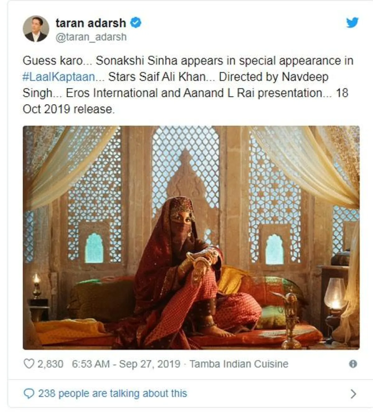 كشفت الشركة المنتجة لفيلم الممثلة Sonakshi Singh سوناكشي سينها Laal Kaptaan، الإطلالة الأولى لها، والتي لم يسبق لها مثيل، وقد وصفها المخرج نافديب سينغ بأنها دور حتمي.