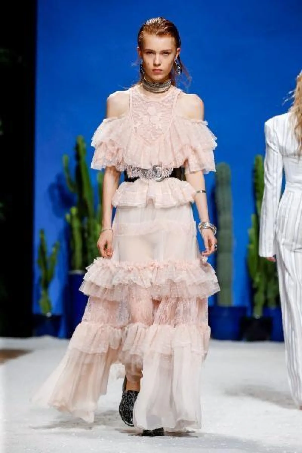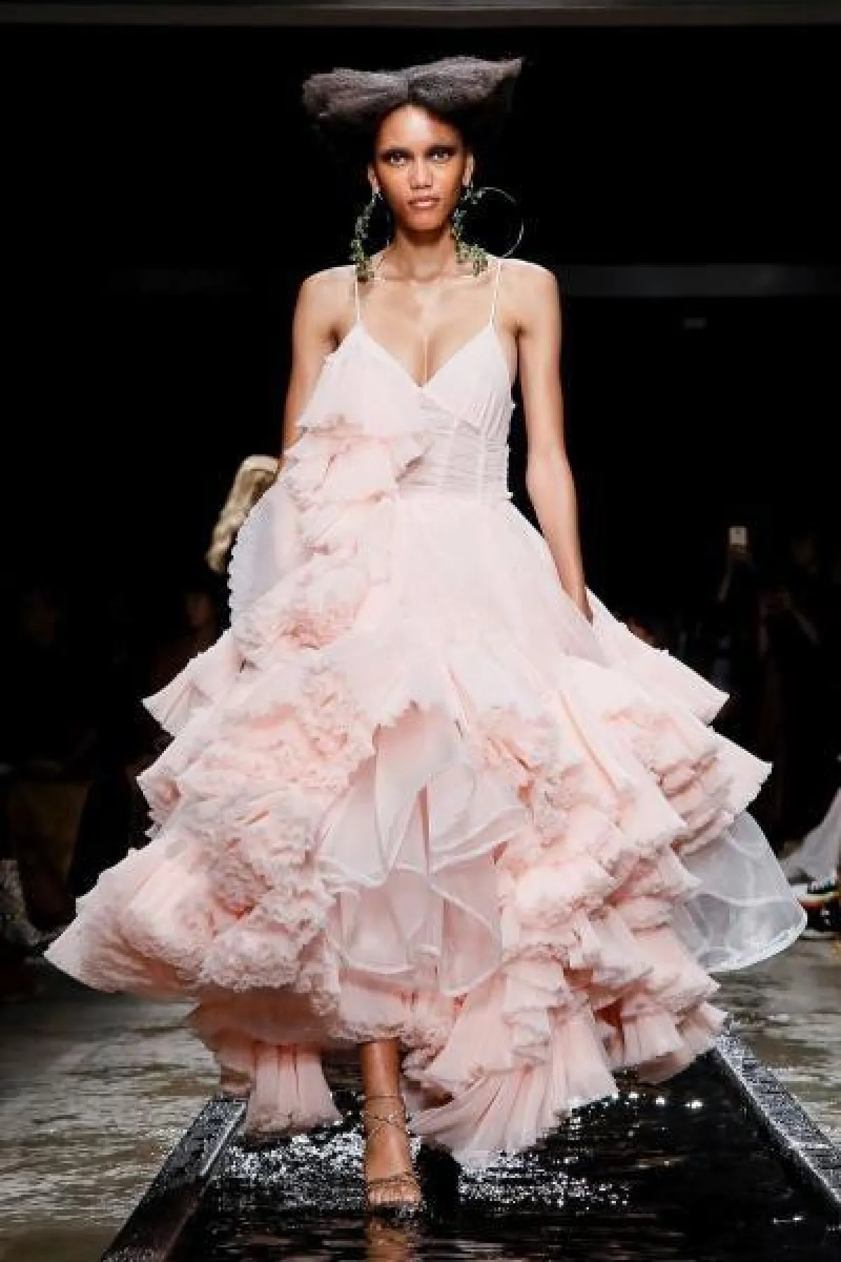قدمت ماركة Act n فستان وردي منفوش بصيحة الكشكش وبحمّالات رفيعة مع طبقات متدرجة الأطوال لإطلالة جذابة ولافتة.
