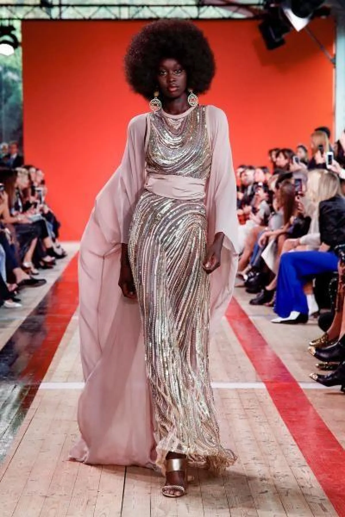 وجمع فستان philosophy di Lorenzo بين الأنوثة والنعومة، وهو بتصميم قصير من الأمام وطويل من الخلف ومزين بالكشاكش والطبعات النابضة بالحيوية.
