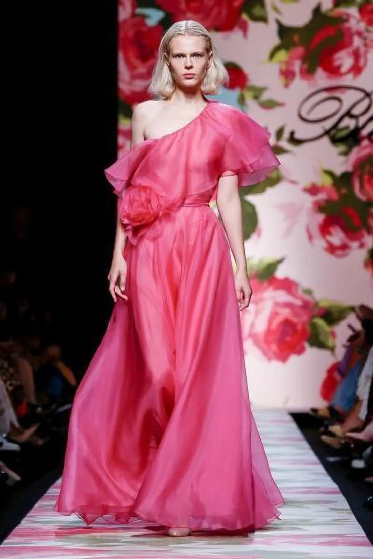 قدمت ماركة بلومارين Blumarine فستان وردي بتصميم ناعم بكتف واحد وتنورة A Line مع وردة كبيرة على الخصر.