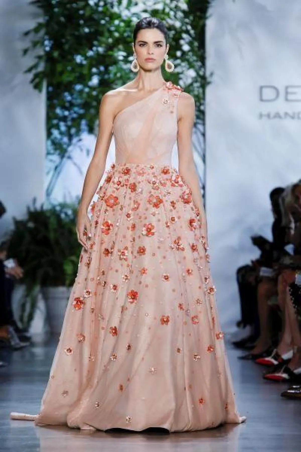 وأعجبنا فستان دينيس باسو المنفوش بالكتف الواحد والمزين بورود بارزة على التنورة.
