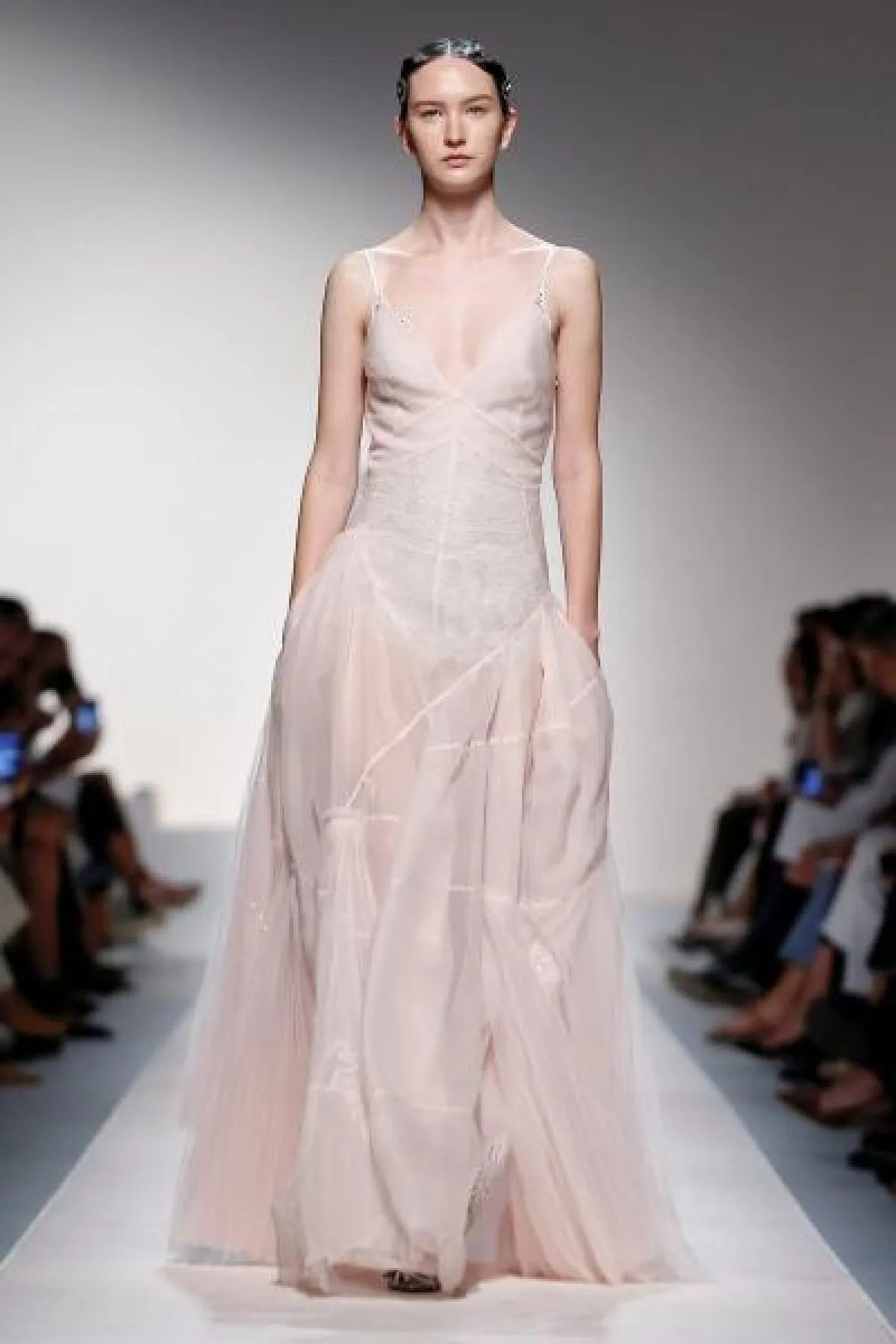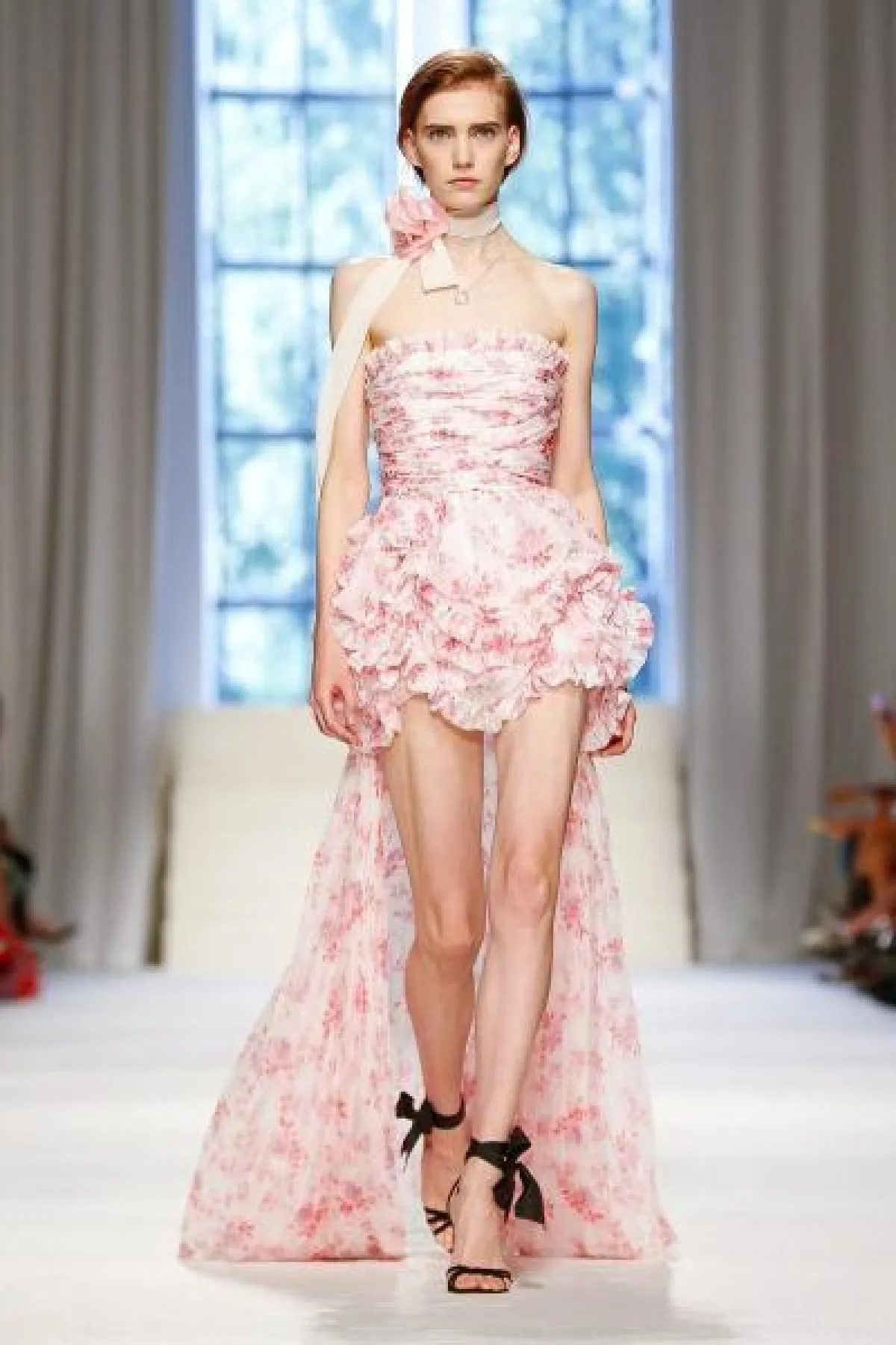 كما قدمت ماركة Ermanno Scervino فستان وردي ناعم بحمّالات رفيعة وتنورة A Line بقماش شفاف.