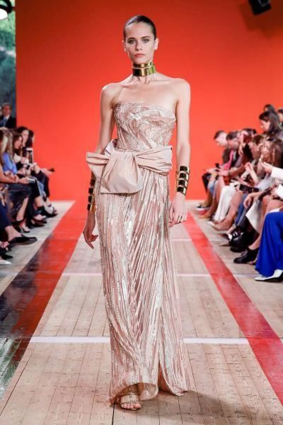 أيضاً قدم المصمم ايلي صعب فستان وردي بقصّات بسيطة ومزينة بتطريزات برّاقة منحتها فخامة.