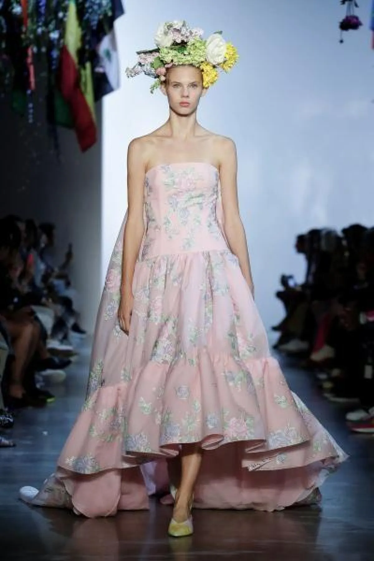 وأحببنا الفستان الوردي الفاتح والمزين بطبعات ناعمة وبتنورة منفوشة من توقيع Prabal Gurung.