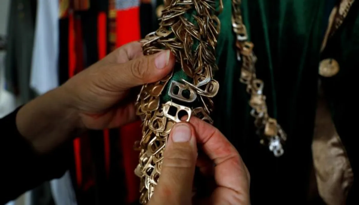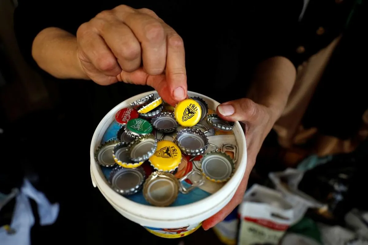 وتعيد المصممة مها شلطف، البالغة من العمر 55 عاماً تدوير الأغطية المعدنية لعبوات وزجاجات المشروبات الغازية إلى ما يشبه عُملات ذهبية وترتر.