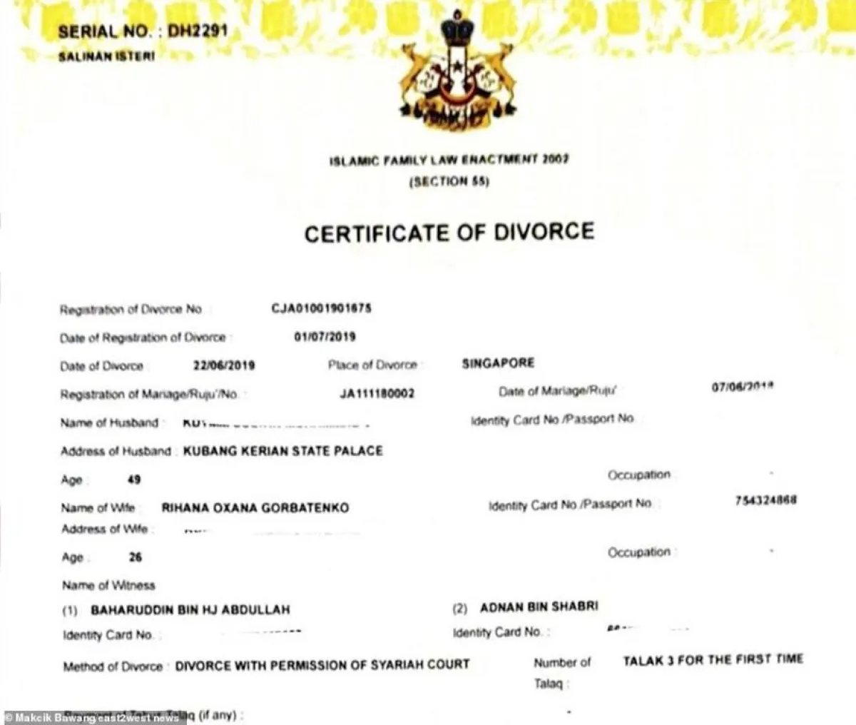 وأضافت صحيفة الديلي ميل الشهيرة، أنه كان قد تم تسجيل الطلاق بشكل رسمي، خلال شهر تموز/يوليو الماضي 2019 في ولاية كيلانتان الماليزية، ونشرت العديد من وسائل الإعلام صوراً لوثيقة الطلاق. ومن الجدير بالذكر أن أوكسانا بعد أسابيع قليلة من ولادة طفلها ليون وإتمام انفصالها عن السلطان محمد الخامس، كانت قد هددت بكشف الكثير من الأسرار عن علاقتهما الزوجية.