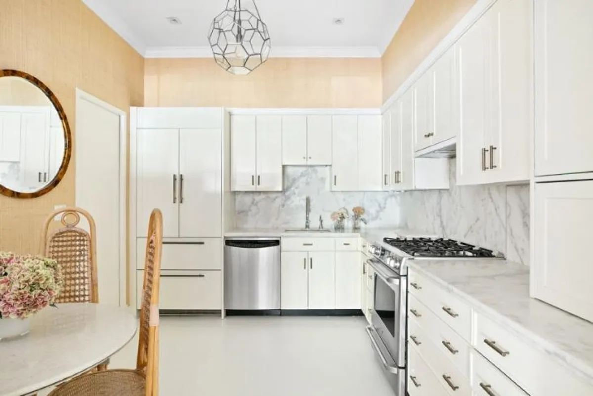 تحضر مجموعة من الخزائن المغلقة، والمعدَّة من الخشب الأبيض في المطبخ، حيث يكسو الرخام أسطح إعداد الطعام. وفي إحدى الزوايا، تتموضع طاولة بسيطة لتناول الوجبات الخفيفة، تحوطها كراس معدَّة من الخيزران بيج اللون، الذي يتماشى مع طلاء الجدارن. أمَّا الجدار الرئيس في المطبخ فيحمل مرآة مستطيلة تتوسَّط وحدتي إنارة.