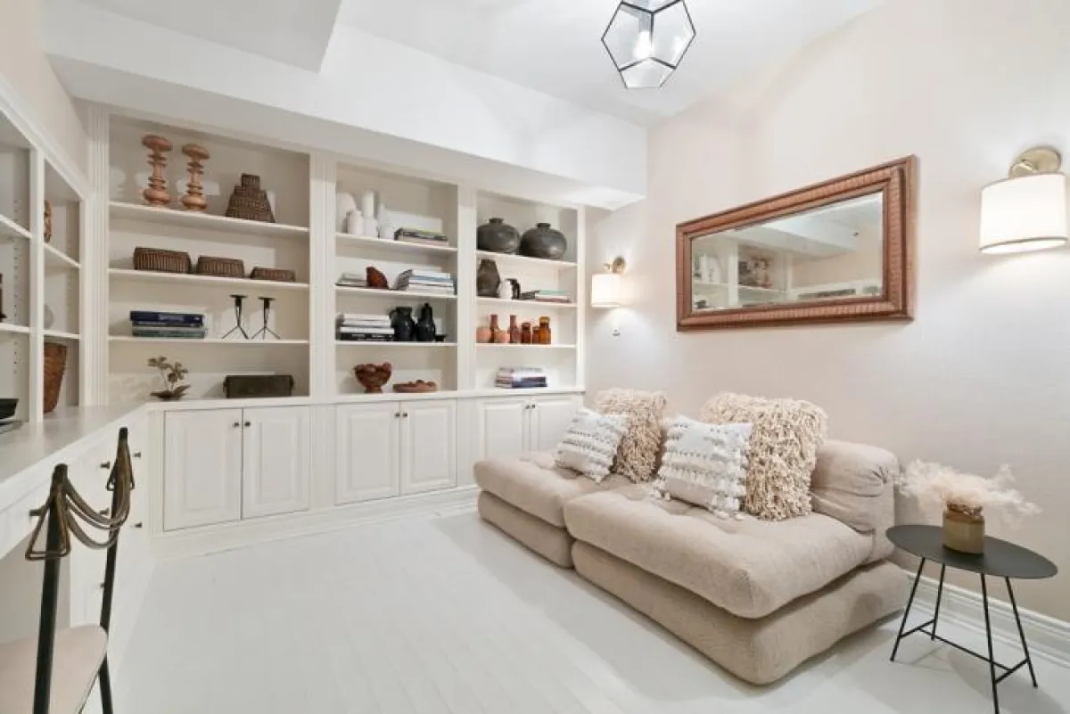 تقتصر مكوّنات غرفة الجلوس على أريكة وثيرة مزوَّدة بمقعدين، فيما تحمل الجدران البيض مجموعة من الرفوف المفتوحة، التي تعرض التحف والإكسسوارات، وأسفلها صُمّمت خزائن مغلقة لتوضيب الأغراض في داخلها.