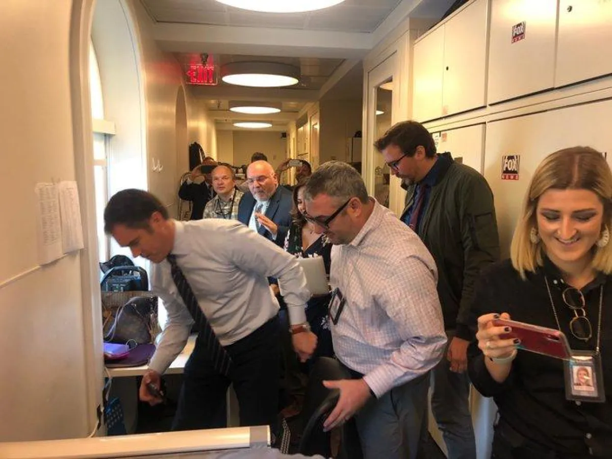 The most excitement in the White House briefing room in months. Reporters attempt to capture a baby mouse that fell on @PeterAlexander lap moments ago pic.twitter.com/6zWRZfTAaq
