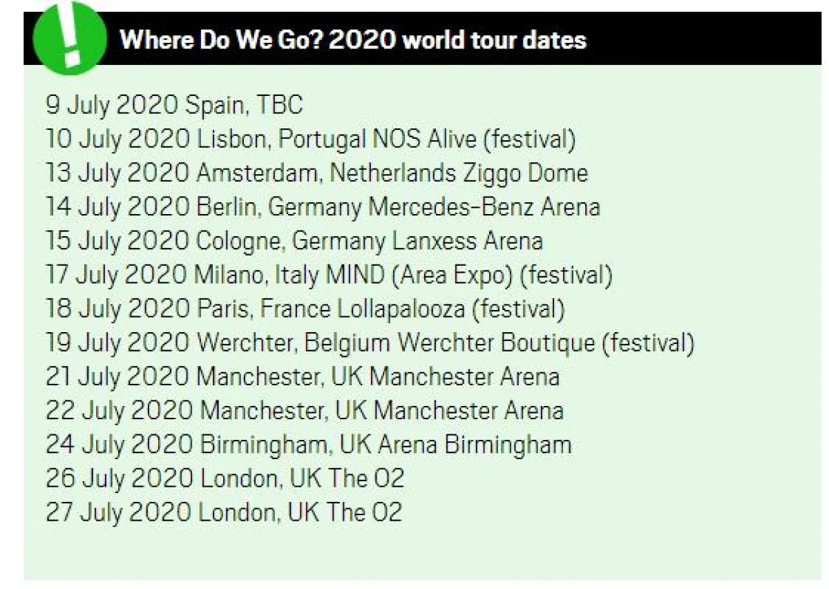 حددت النجمة العالمية بيلي إيليش رسمياً موعد جولتها الغنائية العالمية لعام 2020، وأكدت أنها ستقوم بإحياء عدد من الحفلات في أماكن متنوعة داخل المملكة المتحدة وأوروبا.