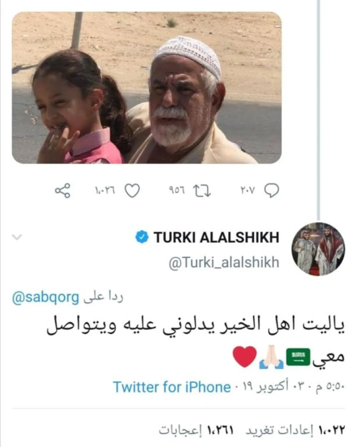 وكان من بين المتفاعلين مع قصة هذا الأب العظيم تركي آل الشيخ، رئيس هيئة الترفيه، حيث غرد طالباً العون في التوصُّل إلى الرجل المسن: "يا ليت أهل الخير يدلوني عليه ويتواصلوا معي".