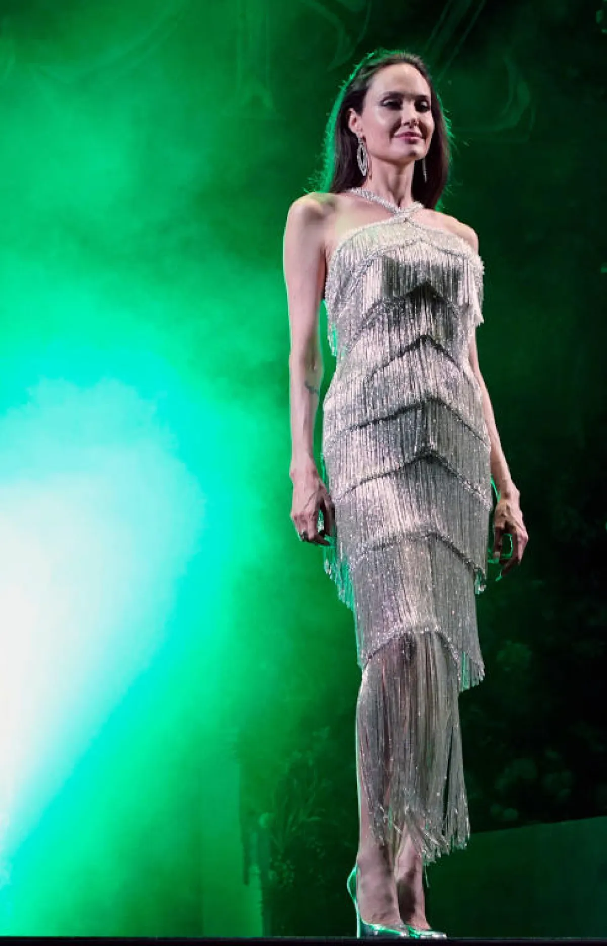 وصلت أنجلينا جولي Angelina Jolie إلى حفل افتتاح فيلم ماليفسانت في جزئه الثاني Maleficent 2 في مدينة طوكيو، في فستان مميز مصنوع من الشراريب البراقة موضة هذا الموسم، وقد اختارته من دار رالف أند روسو Ralph&Russo بتصميم مميز من دون أكمام، وبقصة منسدلة وصل طوله حد الكاحل، وقد نسقت معه حذاءً بكعب عالٍ باللون الفضي، وأقراطًا ماسية لافتة.