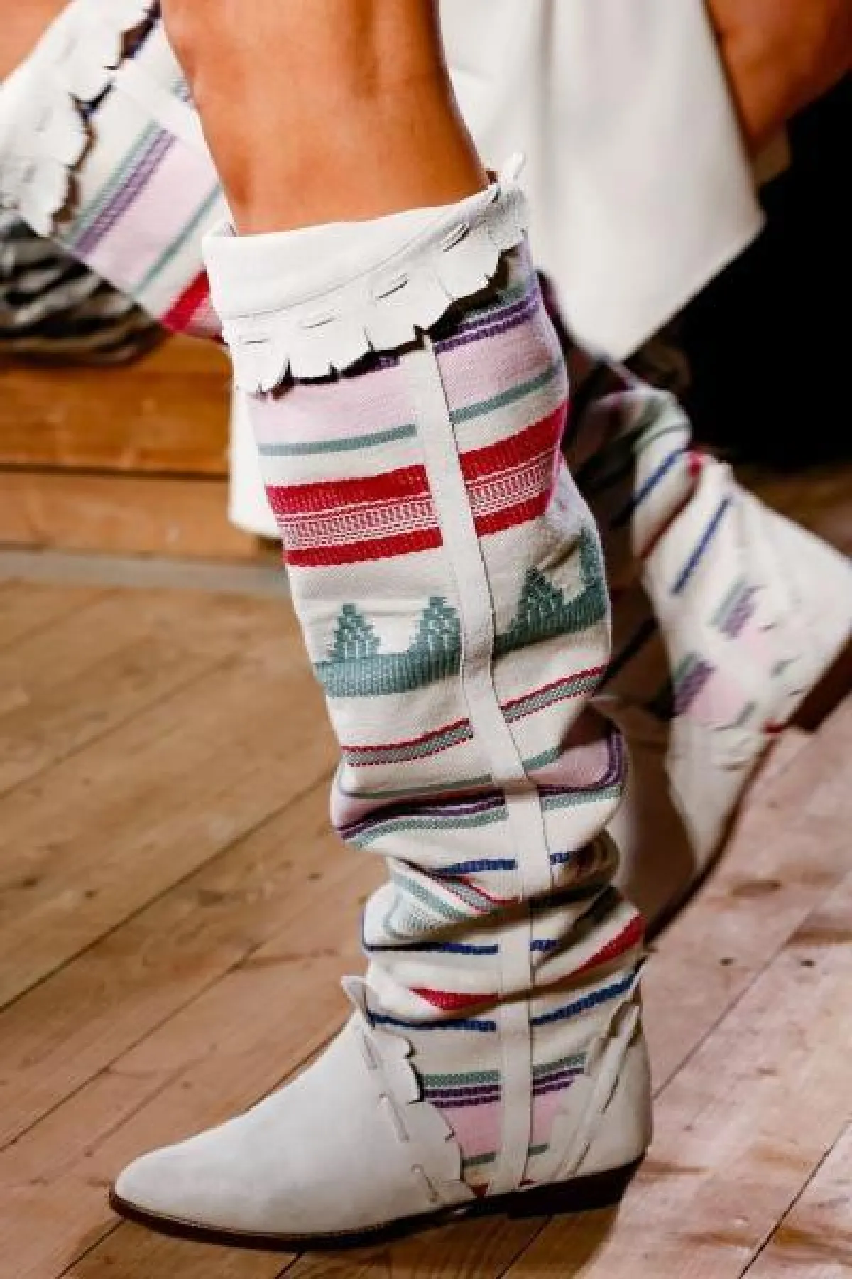 أيضاً قدمت ماركة ايزابيل مارنت حذاء برقبة مرتفعة من القماش المزين بطبعات ملونة متناغمة مع الجلد الأبيض، وهو تصميم عصري يناسب الإطلالات النهارية.