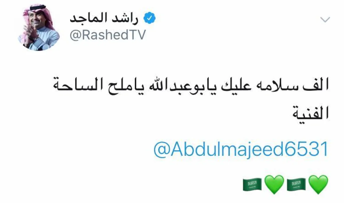 هذا الحديث نشر مثيله راشد الماجد، عبر حسابه الرسمي في "تويتر"، كاتبًا: "ألف سلامة عليك يا بو عبد الله.. يا ملح الساحة الفنية"، وانهالت الردود من متابعي حسابه على هذه البادرة الطيبة التي تحدث فيها راشد عن صديقه عبد المجيد عبد الله.