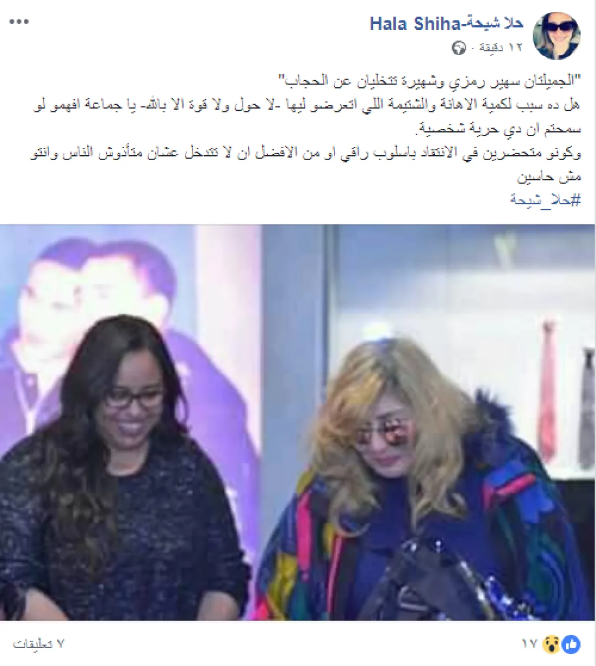 حلا نشرت أحدث صورة للنجمتين سهير رمزي وشهيرة بدون غطاء الرأس وعلقت عليها عبر حسابها بموقع الفيس بوك قائلة: الجميلتان سهير رمزي وشهيرة تتخليان عن الحجاب" هل ده سبب لكمية الاهانة والشتيمة اللي اتعرضو ليها -لا حول ولا قوة الا بالله- يا جماعة افهمو لو سمحتم ان دي حرية شخصية.