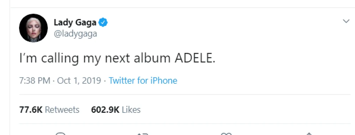 وكتبت غاغا في تغريدها الغامضة قائلة: "سأطلق أسم أديل على ألبومي القادم" بينما لم توضح من قصدت بأسم أديل، هل هي المغنية الشهيرة أم مجرد أسم أحد أصدقائها أو أقاربها؟