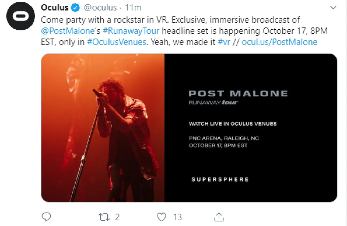 وسيقام الحفل في 17 أكتوبر الجاري، حيث يبدأ الحفل من الساعة 8مساءً،على أن يتم بث حفل " Post Malone’s Raleigh" مباشرة على مستخدمي سماعات Facebook Oculus Go و Quest كما ذكر الحساب الرسمي لـ " Oculus" خلال تغريدته التي نشرها بموقع التواصل تويتر.