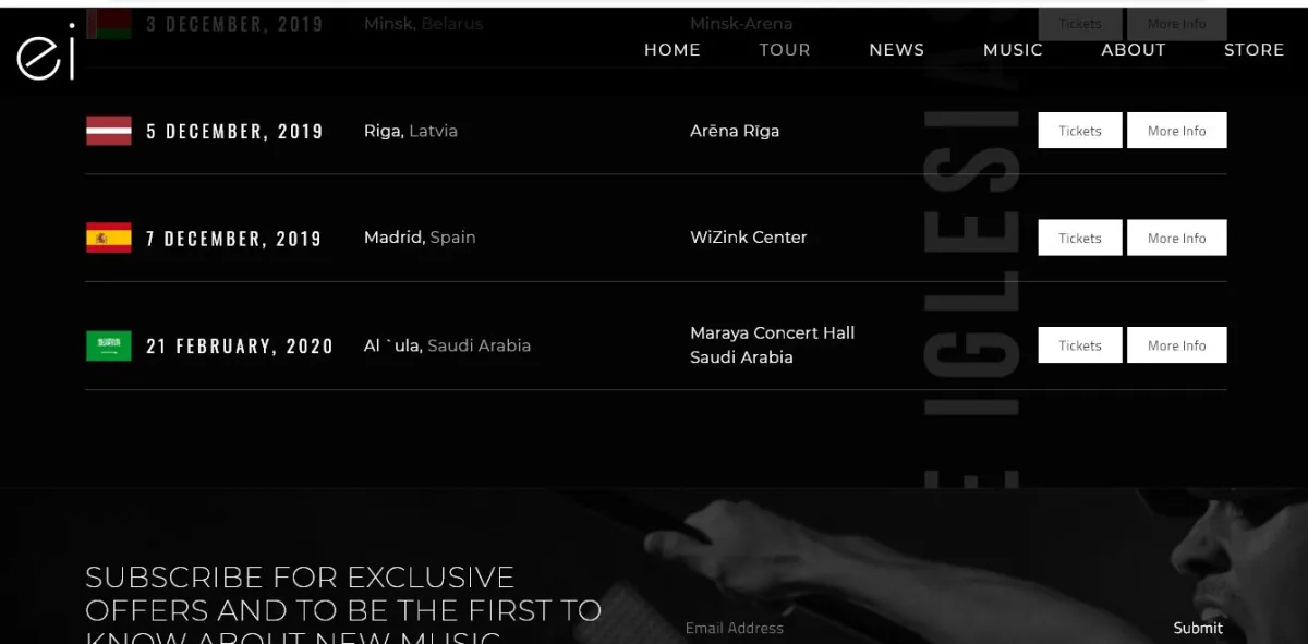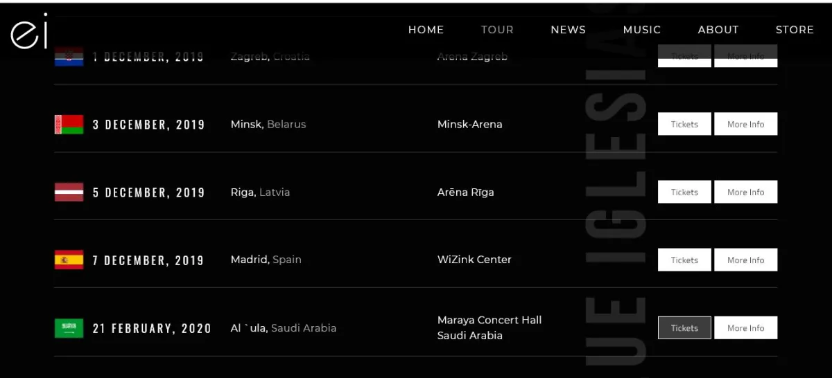 وعلى الرغم من أنّ "إنريكي" أعلن فقط جدول حفلاته لعام 2019، إلا أنّ الموقع الخاص والرسمي له أعلن عن حفلًا بالسعودية عام 2020، ضمن مهرجان "شتاء طنطورة" كاشفاً عن موعد الحفل يوم 21 فبراير/ شباط بفندق "العُلا" بقاعة "مرايا" في تمام الساعة السابعة، حسب ما أوضح موقعه الرسمي.