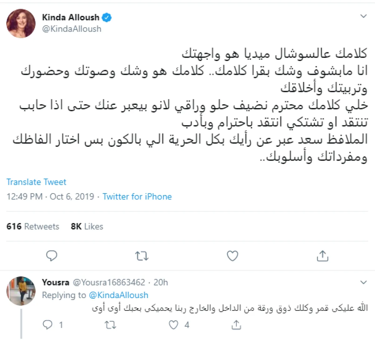 تابعت قائلة: خلي كلامك محترم نضيف حلو وراقي لانو بيعبر عنك حتى اذا حابب تنتقد او تشتكي انتقد باحترام وبأدب "الملافظ سعد" عبر عن رأيك بكل الحرية الي بالكون بس اختار الفاظك ومفرداتك وأسلوبك.