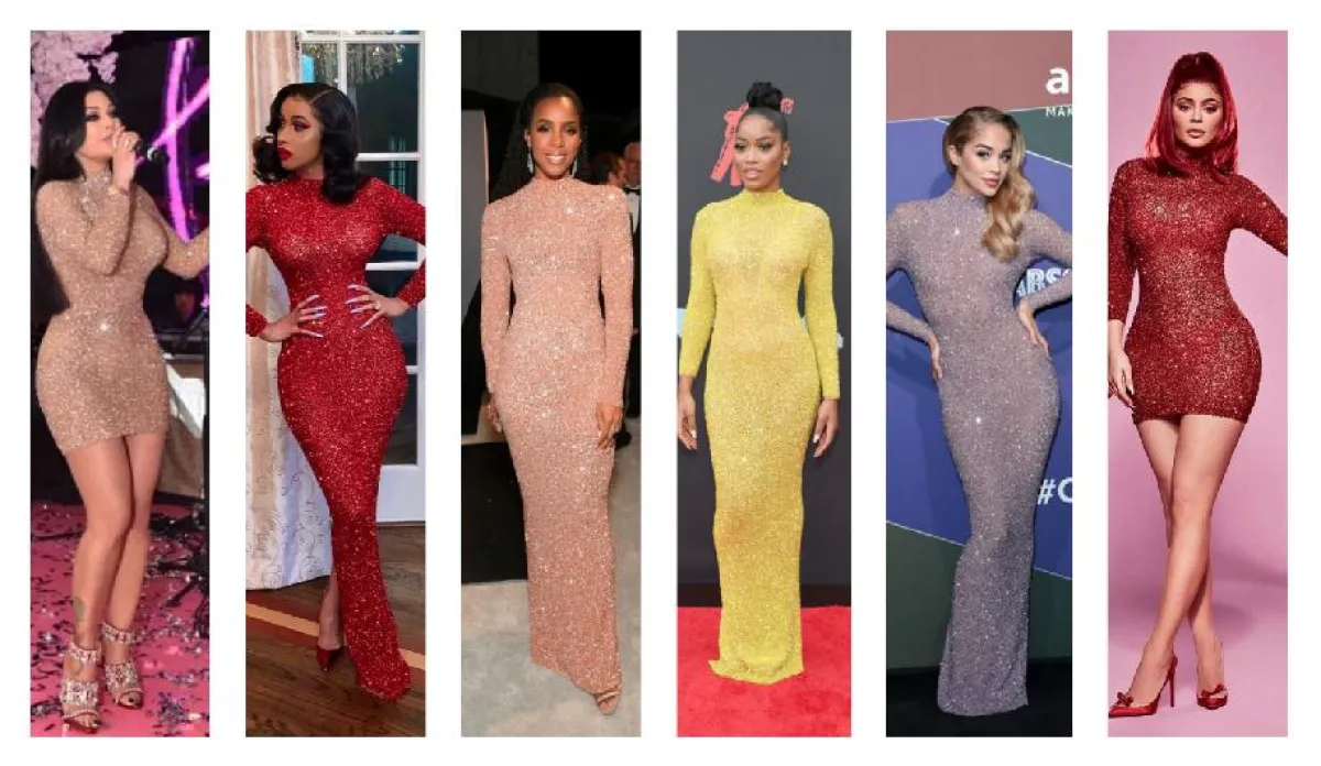كما ذكرنا فإن هذا الفستان البراق من يوسف الجسمي Yousef Aljasmi أصبح شهيراً بين النجمات العالميات والعربيات وقد شاهدنا الكثيرات منهن وقد اخترنه في مختلف المناسبات مثل هيفاء وهبي وكايلي جينير Kylie Jenner اللتان اعتمدتا النسخة القصيرة منه، اضافة الى كيلي رولاند Kelly Rolland، وكايت بالمر Kate Plamer، وكاردي بي Kardi B، وجاسمين ساندرز Jasmine Sanders اللواتي اخترن نفس الفستان لكن بألوان مختلفة.