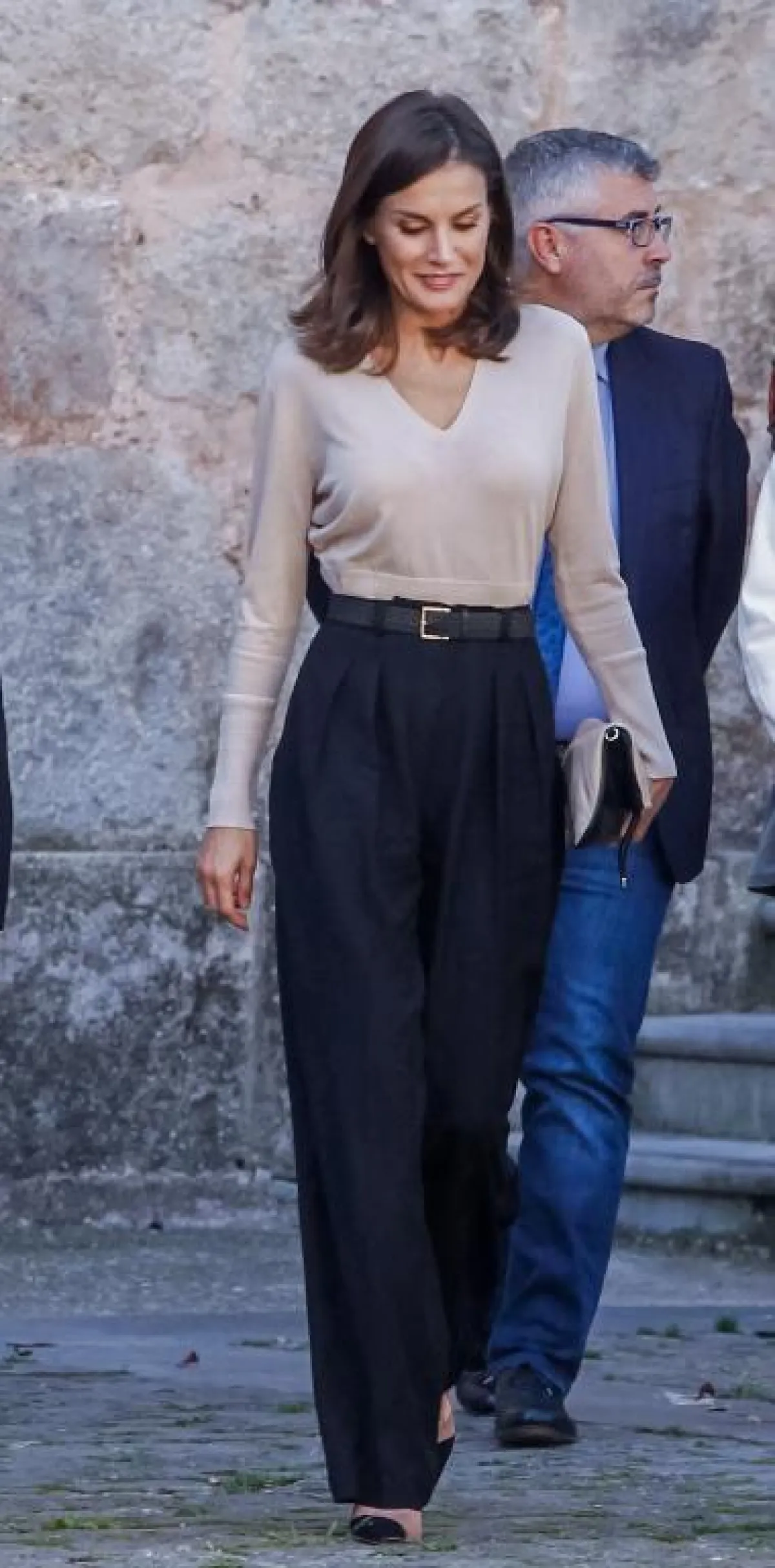 تشتهر الملكة ليتيزا زوجة فيليب السادس، ملك إسبانيا ،بأناقة خاصة تميزها عن باقي الملكات والأميرات الأوروبيات ،فرغم بساطة إطلالاتها ،إلا أنها تتميز بذوق راق ورفيع،فهي تجيد إلى حد كبير، تنسيق الأزياء التي ترتديها ،بحيث تبدو عصرية ، لكنها تطعمها دائما بلمسة ملكية ، وقد كرست ذوقها الرفيع في الأزياء، في آخر إطلالة لها ،وهذا بمناسبة مشاركتها في الملتقى العالمي للغةوالصحافة ، الذي نظم يوم الثالث من أكتوبر الحالي في مدينة"سان ميلان دولاغوكولا " في إسبانيا ،وقد إرتدت بهذه المناسبة ، بنطالون عالي الخصرورمادي اللون من وحي موضة الثمانينات، حددت خصرها الرفيع بحزام جلدي من نفس اللون ،منحها إطلالة أكثر رشاقة ،نسقته بكنزة صوفية بيج ، وحذاء عالي الكعب وثنائي اللون، من علامة " ستيف مادن " .