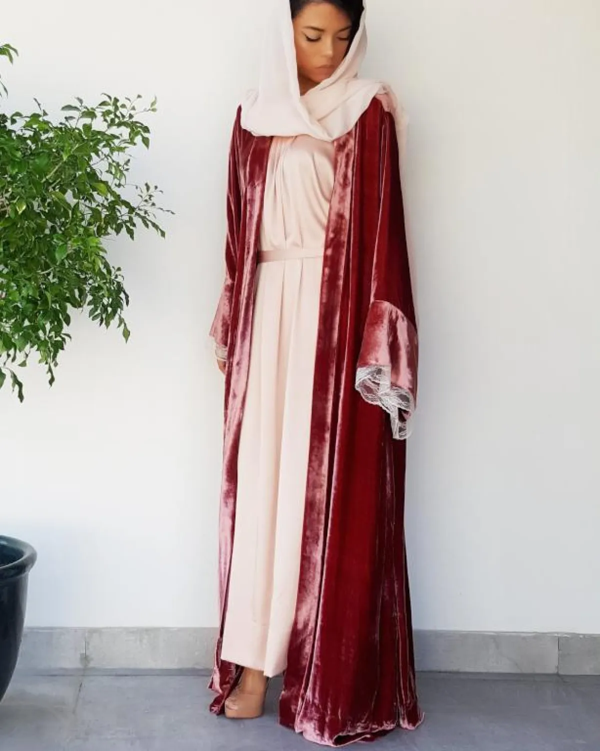 لفتنا هذا الموديل الجذاب من Qabeela Biz، للعبايه من الساتان المخملي بدرجات الروز الناعمة، مع التصميم المفتوح للقفطان المفتوح بخامة الفيلفت لتنسيق مميز، واطلالة متكاملة، ومناسبة كذلك للموسم القادم، مناسبة وعملية لكل الصبايا.