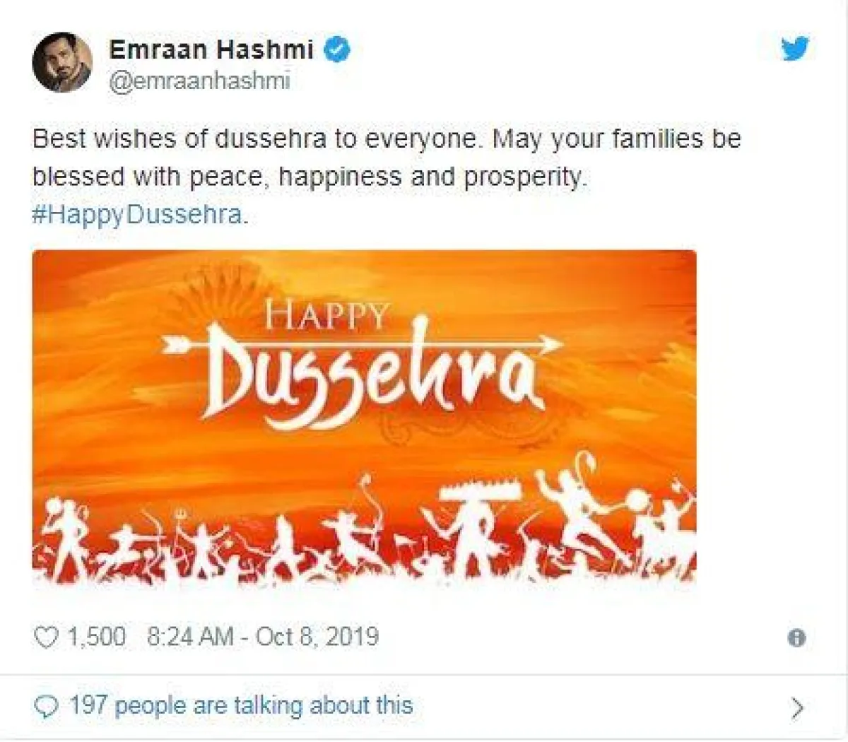 النجم عمران هاشمي Emraan Hashmi الذي حقق نجاحًا كبيرًا مؤخرًا في فيلم " Netflix’s Bard of Blood" تمنّى لجمهوره على تويتر السعادة والسلام والازدهار في يوم Dussehra.