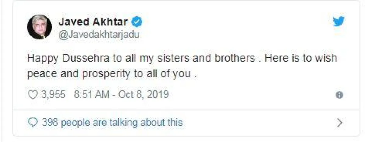 النجم جافيد اختر Javed Akhtar الحاصل على جائزة الغناء الوطني، غرد على تويتر بالقول: "أتمنى يومًا Dussehra سعيدًا لجميع إخوتي وأخواتي، أن يعمّ السلام والطمأنينة في قلوبكم."