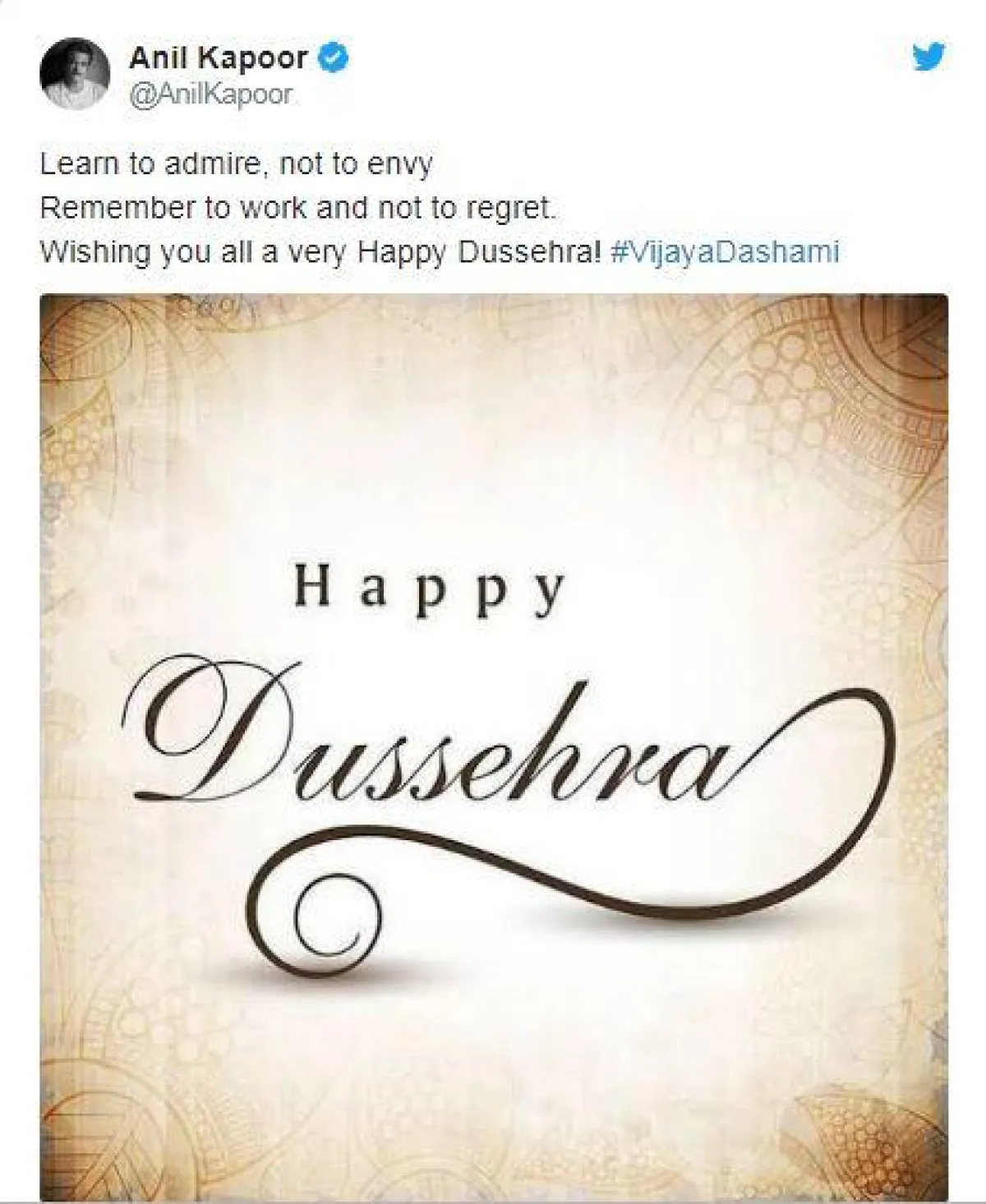 النجم أنيل كابور Anil Kapoor الذي ينشغل حاليًّا في تصوير فيلمه الجديد " Anees Bazme’s Pagalpanti" غرّد على تويتر بالقول: "تعلّم الإعجاب والحب بعيدًا عن الحسد، تذكر أن تعمل ولا تندم، أتمنى لكم عيدًا سعيدًا في مناسبة Dussehra."