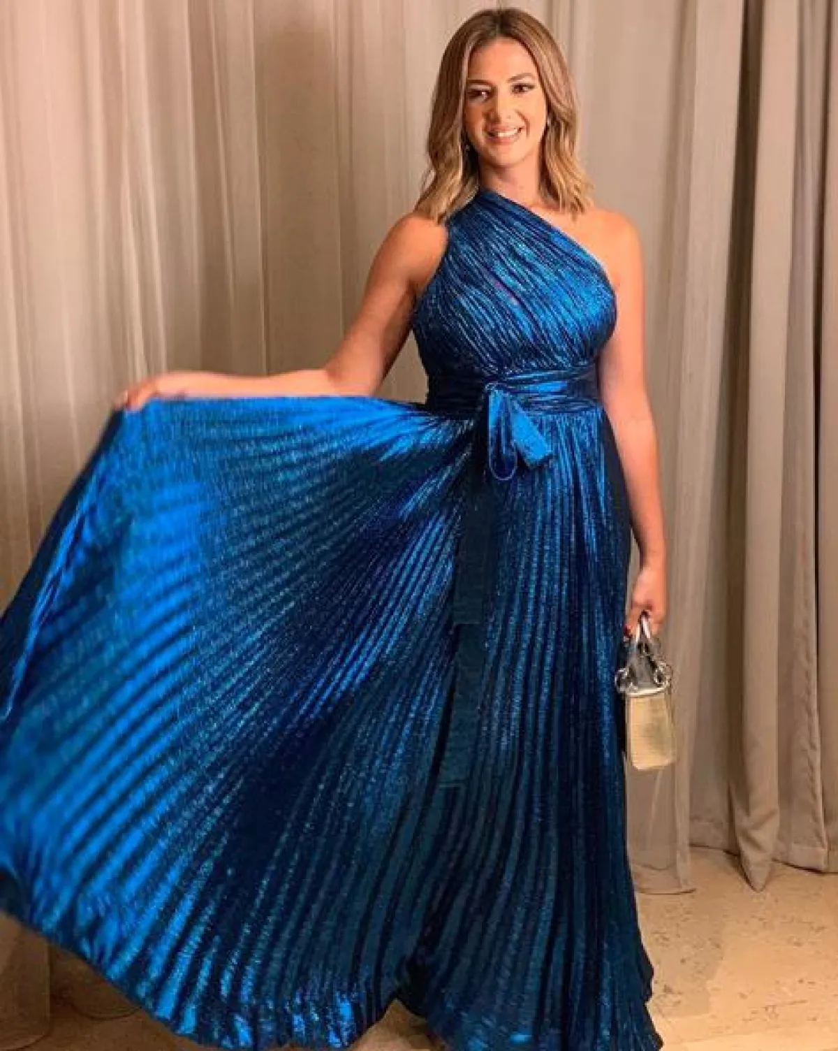 اطلالة ثانية موفقة شاهدنا فيها دنيا سمير غانم مؤخرًا، كانت عبارة عن فستان ميتالك باللون الأزرق اختارته من إيلي صعب Elie Saab بقماش البليسيه الرائج هذا الموسم، وبقصة الكتف الواحدة التي ناسبتها، وقد نسقت معه شنطة يد من الجلد الفضي من ديور Dior، لكنّ هذا الفستان كانت قد سبقتها إليه نجمات عربيات وعالميات، وكنا نفضل أن نشاهدها في تصميم جديد.