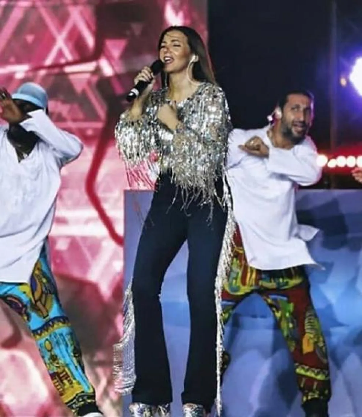 سنبدأ أولًا بالاطلالات الموفقة، ومنها هذا اللوك العصري ذو الطابع الجريء الذي اعتمدته دنيا سمير مؤخرًا، وكان عبارة عن فستان قصير من الترتر البراق باللونين الأسود والأزرق، قصته مواكبة للموضة وقد ناسبتها وناسبت قوامها، ولا سيما مع الحزام على الخصر، وقد اعتمدت مع اللوك حذاءً من البلاستيك الشفاف، كان يفضل لو أنها استبدلته بحذاء باللون الأسود لكان بدا اللوك أكثر أناقة.