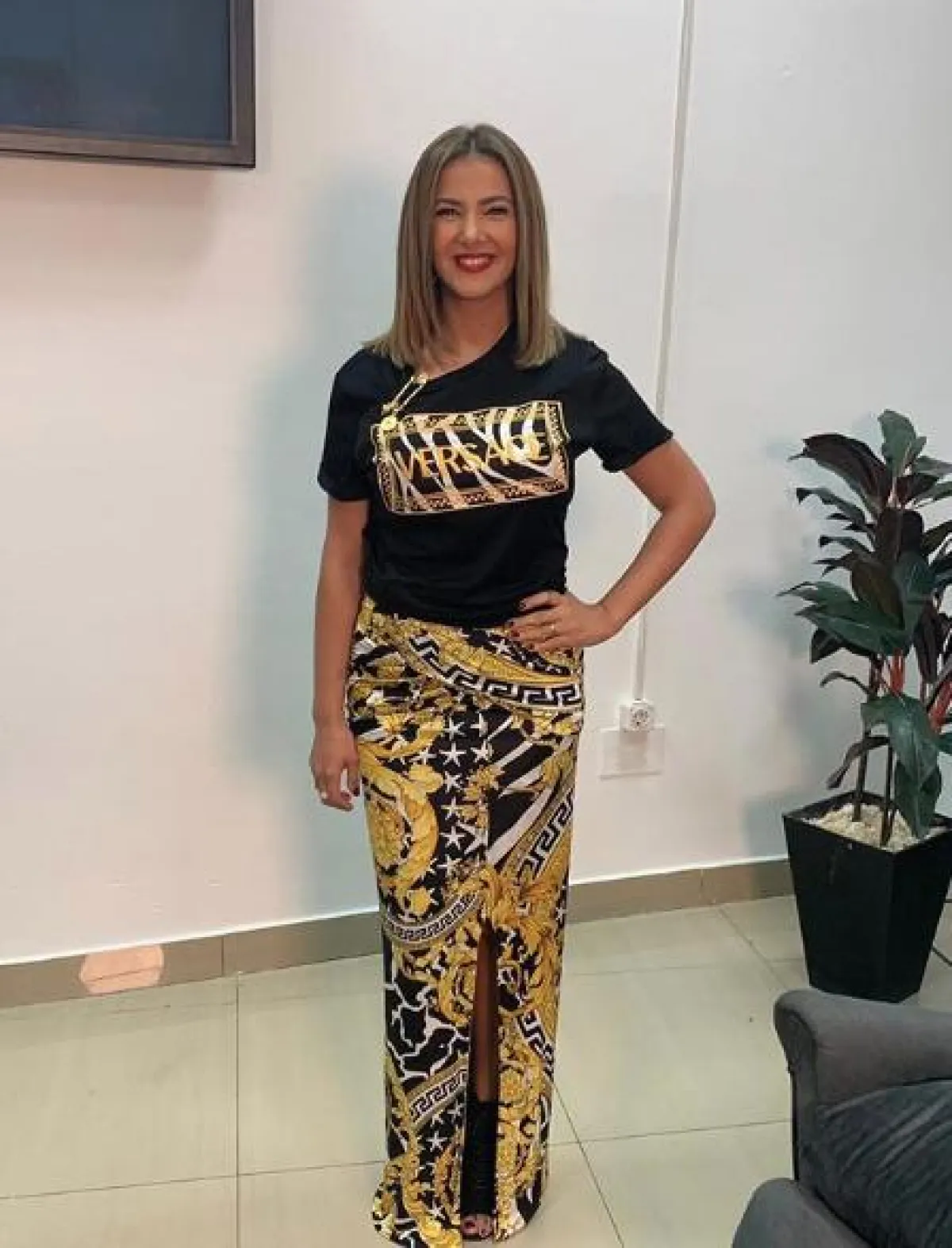 أزياء فيرساتشي Versace رائجة جدًّا هذا الموسم، وكنا قد شاهدنا عددًا كبيرًا من النجمات العربيات والعالميات، وقد اعتمدنها مؤخرًا في اطلالاتهن، ومنهنّ دنيا سمير غانم التي لم تكن موفقة أبدًا في خيارها، وقد اعتمدت لوك مبهرجًا لم تحسن تنسيقه، كان عبارة عن تنورة ماكسي معرّقة مع تيشرت مزينة باسم الدار، والزخارف أيضًا، وكان يجب عليها استبدال التنورة أو التوب بتصميمات بلون واحد كالأسود مثلًا.