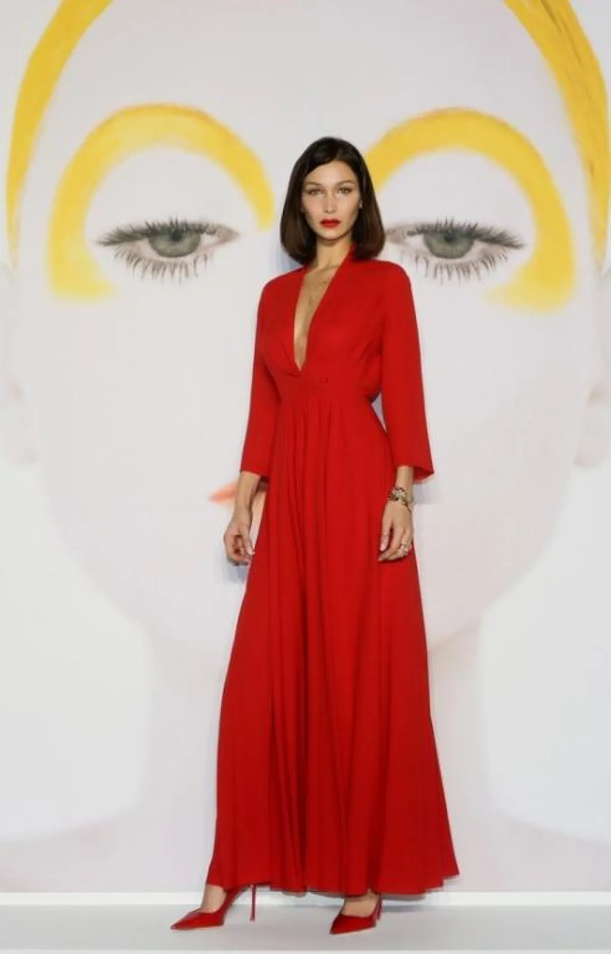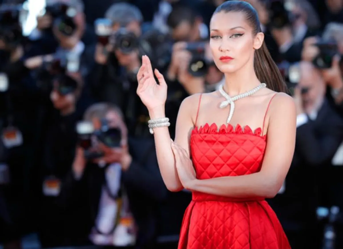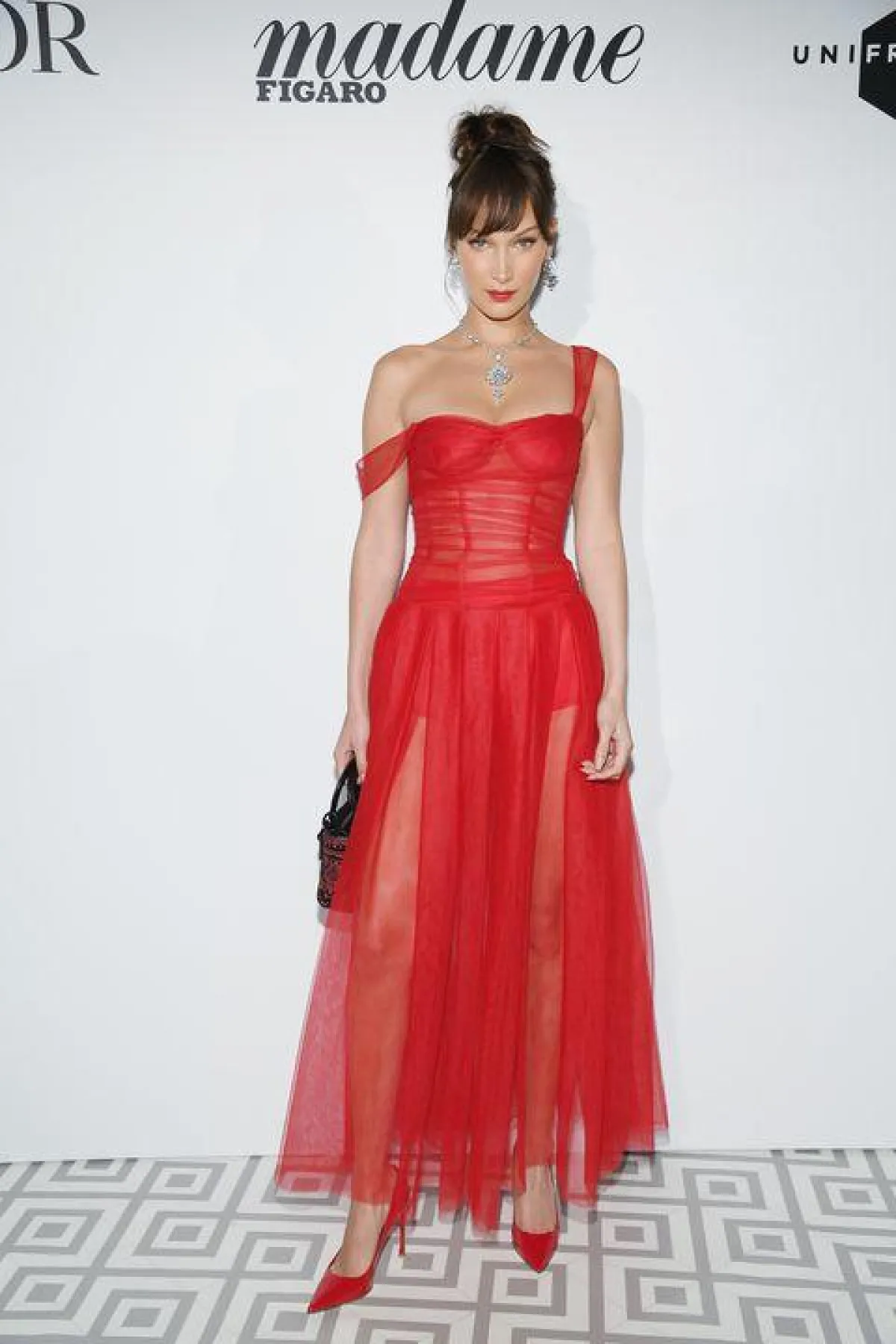 لاحظنا أنّ اللون الأحمر من الدرجات المفضلة بالنسبة لـ بيلا، وكثيرًا ما تختاره في مختلف المناسبات، مثل هذه المناسبة التي تألقت بها بأسلوب أنثوي رومانسي، وقد اختارت فستان ماكسي من التول باللون الأحمر من "ديور" Dior بقصة الكورسيه، وقد نسقت معه حذاءً بكعب عالٍ من اللون نفسه، وشنطة يد صغيرة من الجلد، وزينت الاطلالة بمجوهرات ماسية فاخرة.