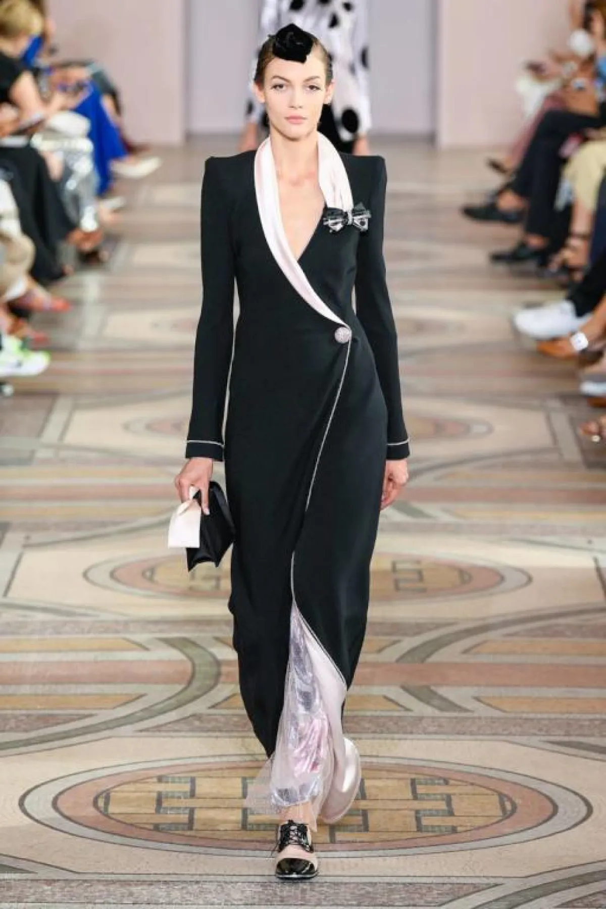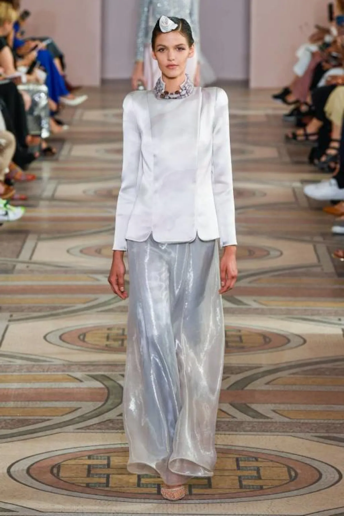 أو يمكنكِ اعتماد هذا الموديل البسيط والناعم من قطعتين لدار Armani Prive آرماني برايف، من الأورغانزا مع البلوزة الساتان الناعمة، مناسب لحفل الخطوبة في المنزل، وللصبايا طويلات القامة.